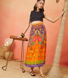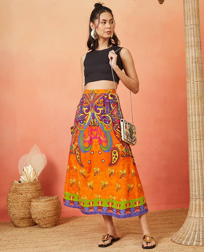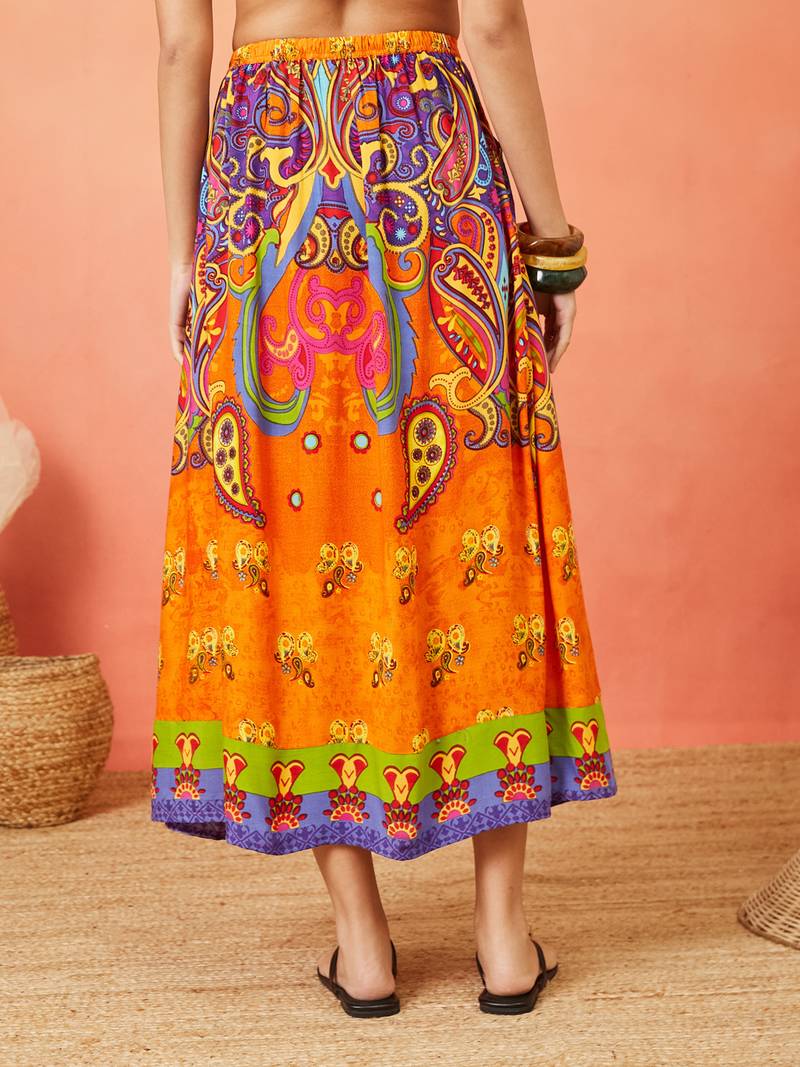 | Product Description | This Is A High Waisted, Flared Midi Or Maxi Skirt Featuring An Eclectic And Symmetrical Paisley Print. Its Bright Color Palette And Intricate Detailing Make It A Standout Choice For Resort Wear Or Summer Festivals.Likely Crafted From A Cotton Rayon Blend Or A Smooth Viscose. The Fabric Appears To Have A Soft, Fluid Drape With A Subtle Sheen, Ensuring Comfort And Easy Movement.A Heavy Paisley And Baroque Fusion Print. The Design Utilizes A Vibrant Orange Base Accented With Electric Purple, Lime Green, And Fuchsia Motifs. |