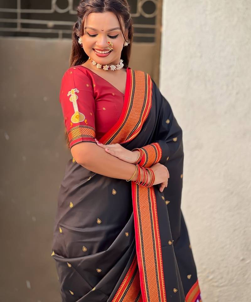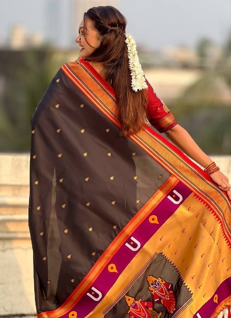Soft Silk Sarees With Tilak Motifs Weaves All Over The Body Having Rich Woven Paithani Vitthala Rakhumai Pallu And Traditional Paithani Border Paired With Brocade Fancy Blouse Same As Shown
