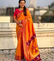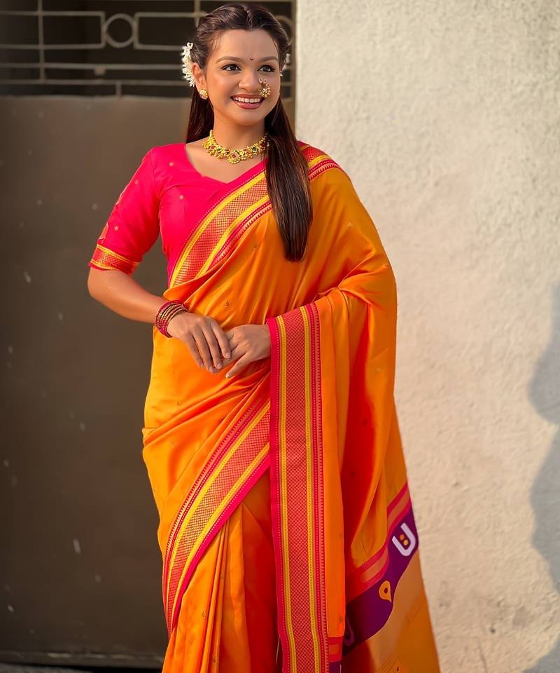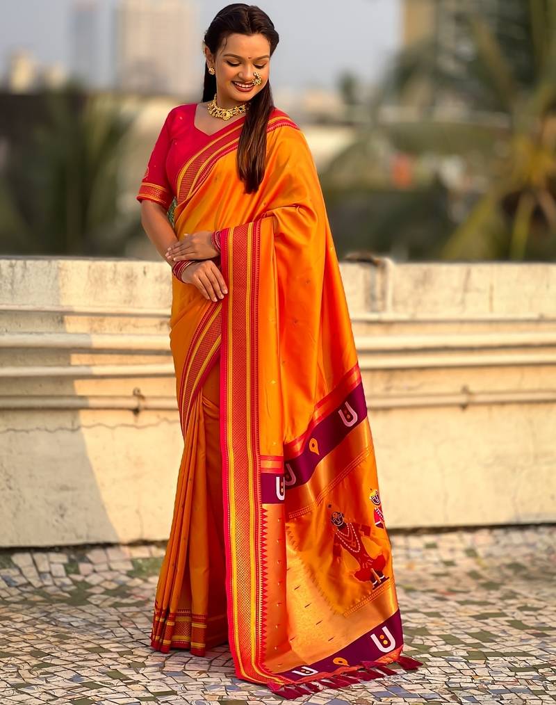 | Product Description | Soft Silk Sarees With Tilak Motifs Weaves All Over The Body Having Rich Woven Paithani Vitthala Rakhumai Pallu And Traditional Paithani Border Paired With Brocade Fancy Blouse Same As Shown |