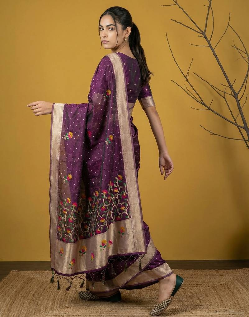 Soft organza meenakari woven saree with jamdani zari pallu and brocade blouse