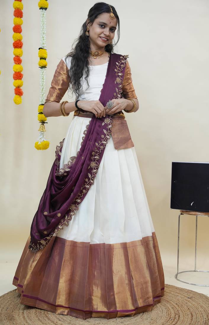 Beautiful south indian style semi-stitched half saree with blouse and rangoli dupatta for women