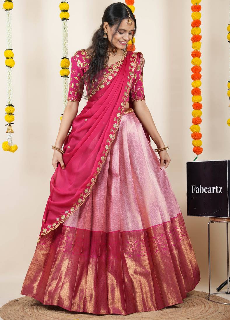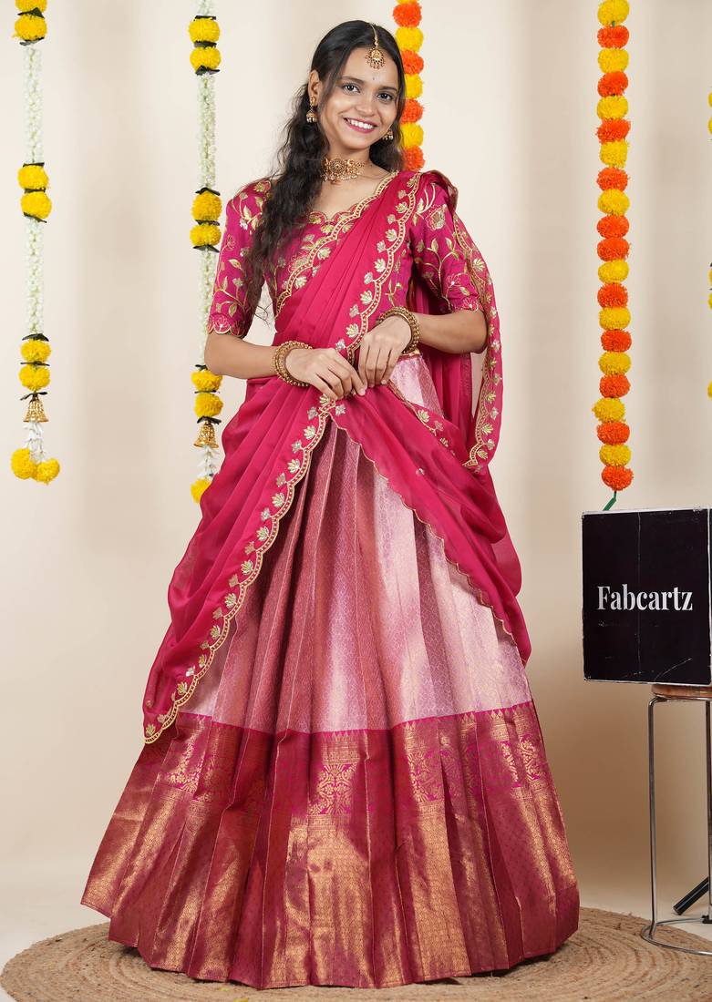 Beautiful south indian style semi-stitched half saree with embroidered blouse and rangoli dupatta for women