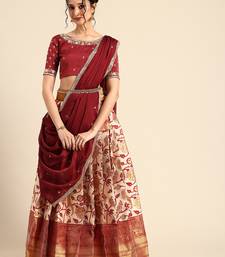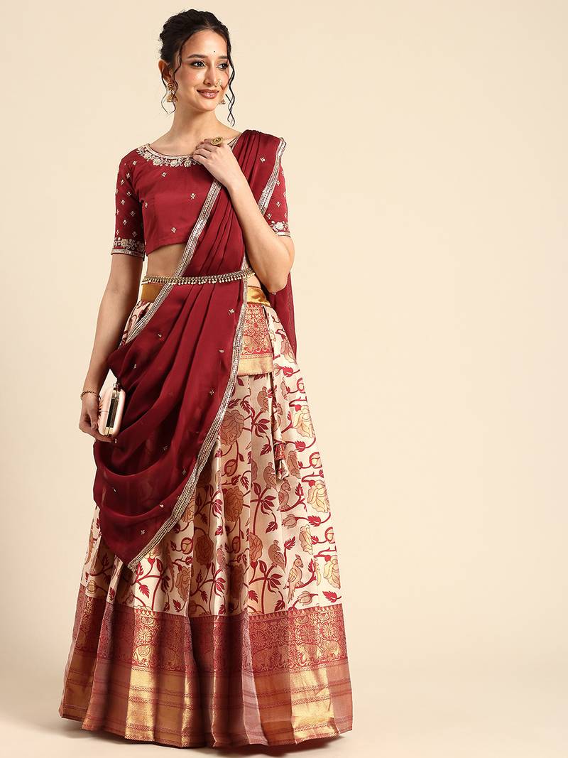 Beautiful south indian style semi-stitched half saree with embroidered blouse and rangoli dupatta for women