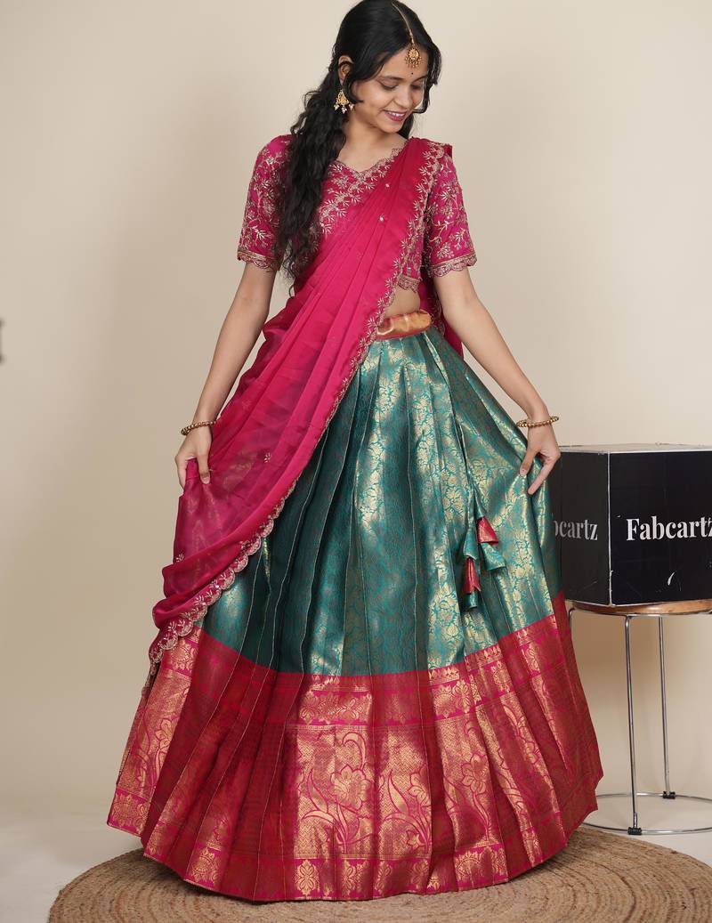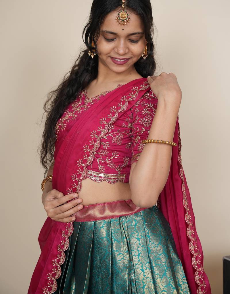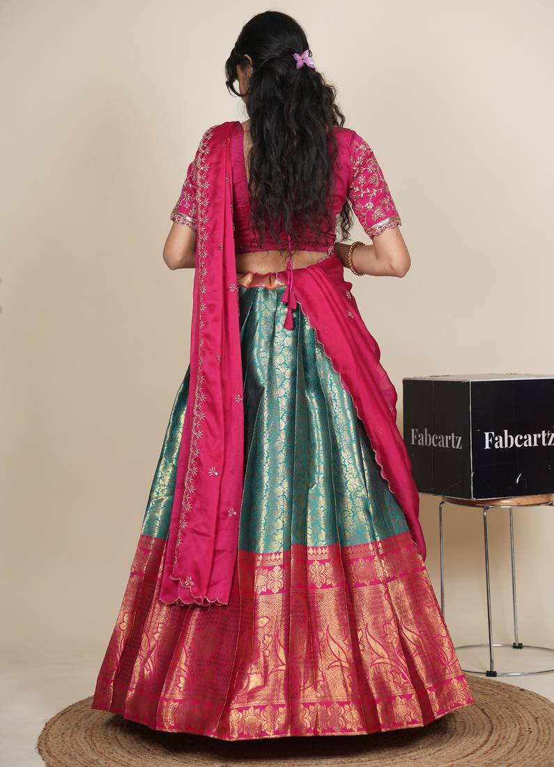 | Product Name | Beautiful South Indian Style Semi Stitched Half Saree With Embroidered Blouse And Rangoli Dupatta For Women | |