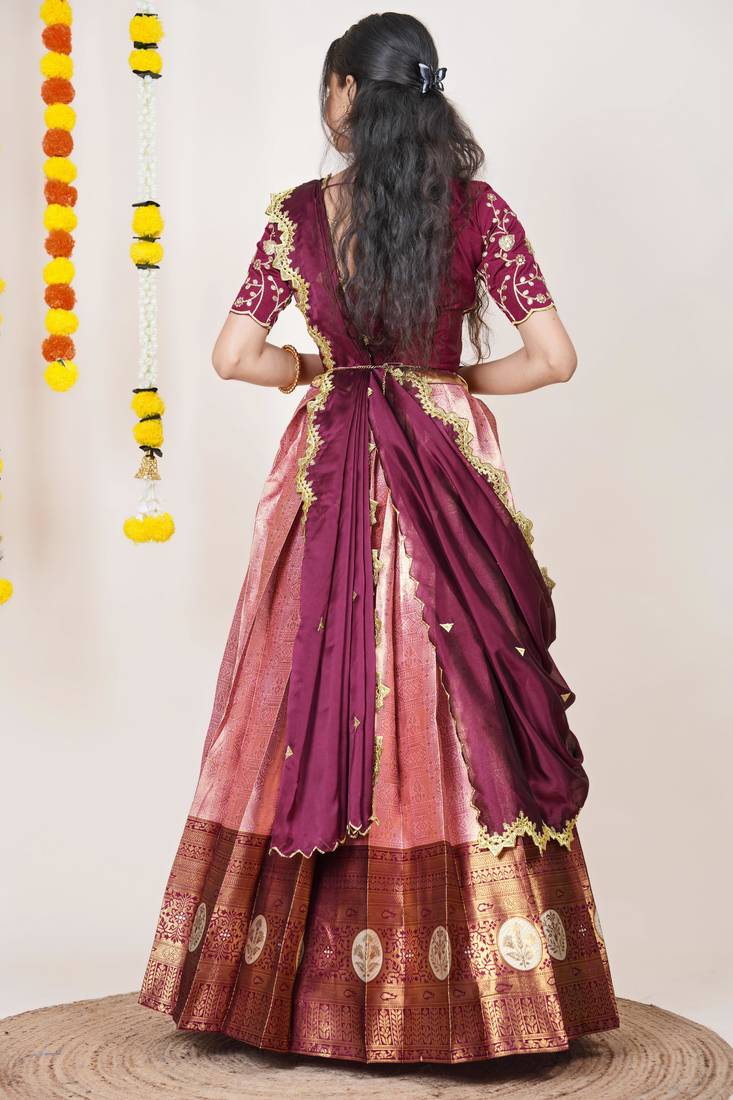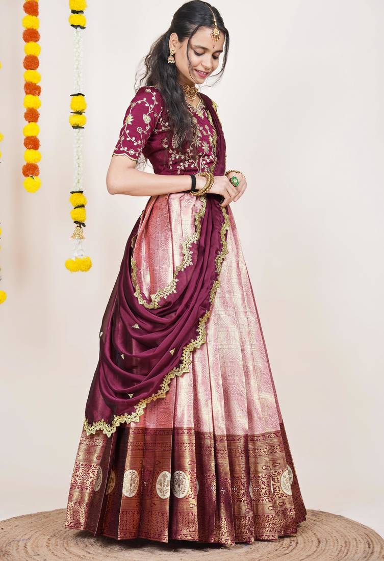 Beautiful south indian style semi-stitched half saree with embroidered blouse and rangoli dupatta for women
