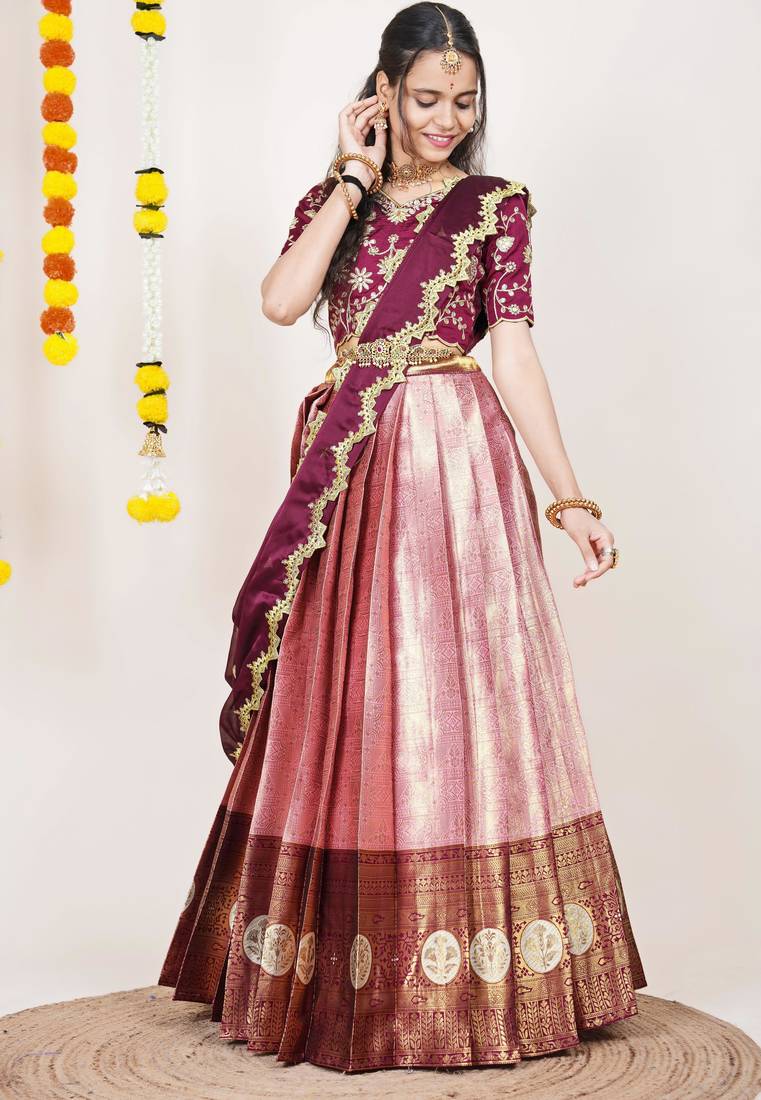 | Product Name | Beautiful South Indian Style Semi Stitched Half Saree With Embroidered Blouse And Rangoli Dupatta For Women | |