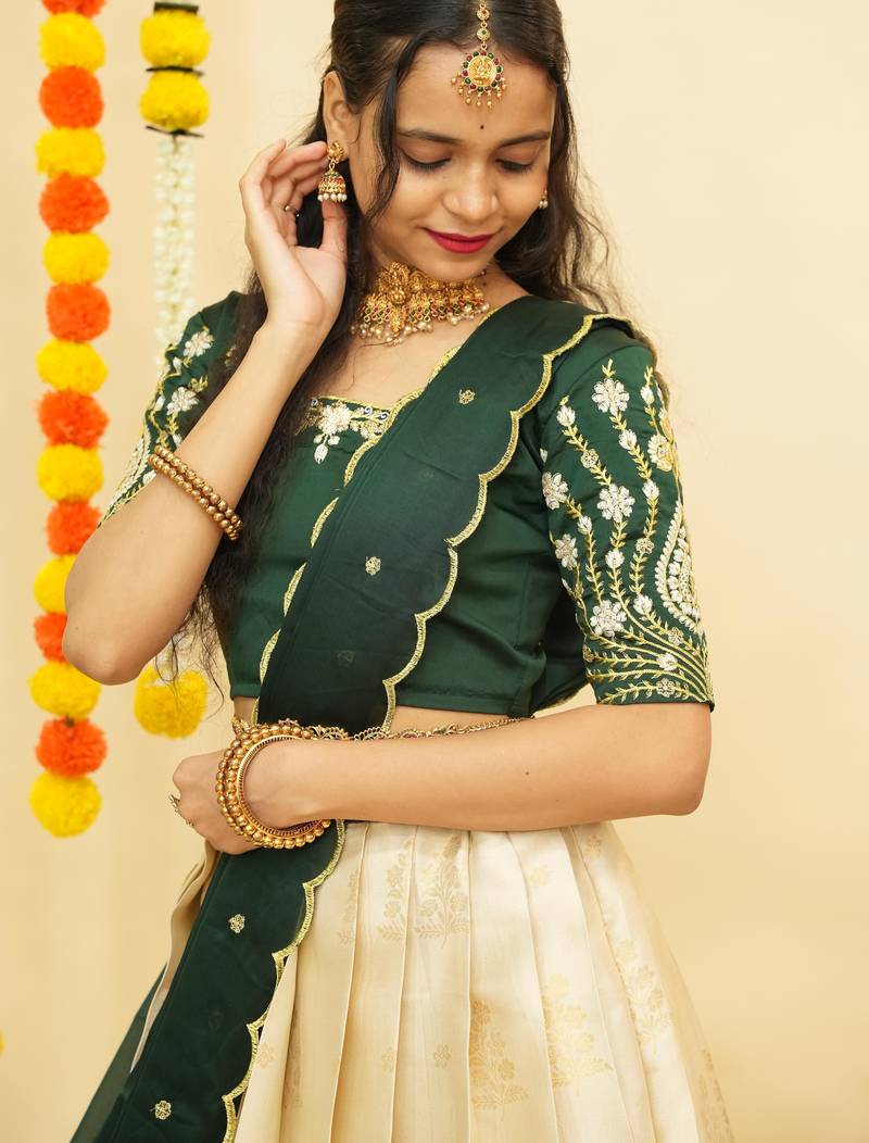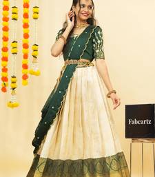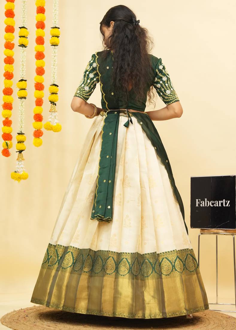 Beautiful south indian style semi-stitched half saree with embroidered blouse and rangoli dupatta for women