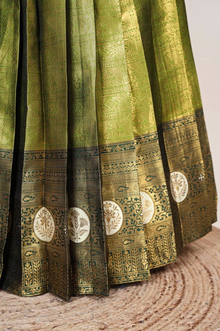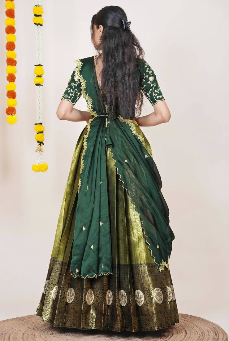 Beautiful south indian style semi-stitched half saree with embroidered blouse and rangoli dupatta for women