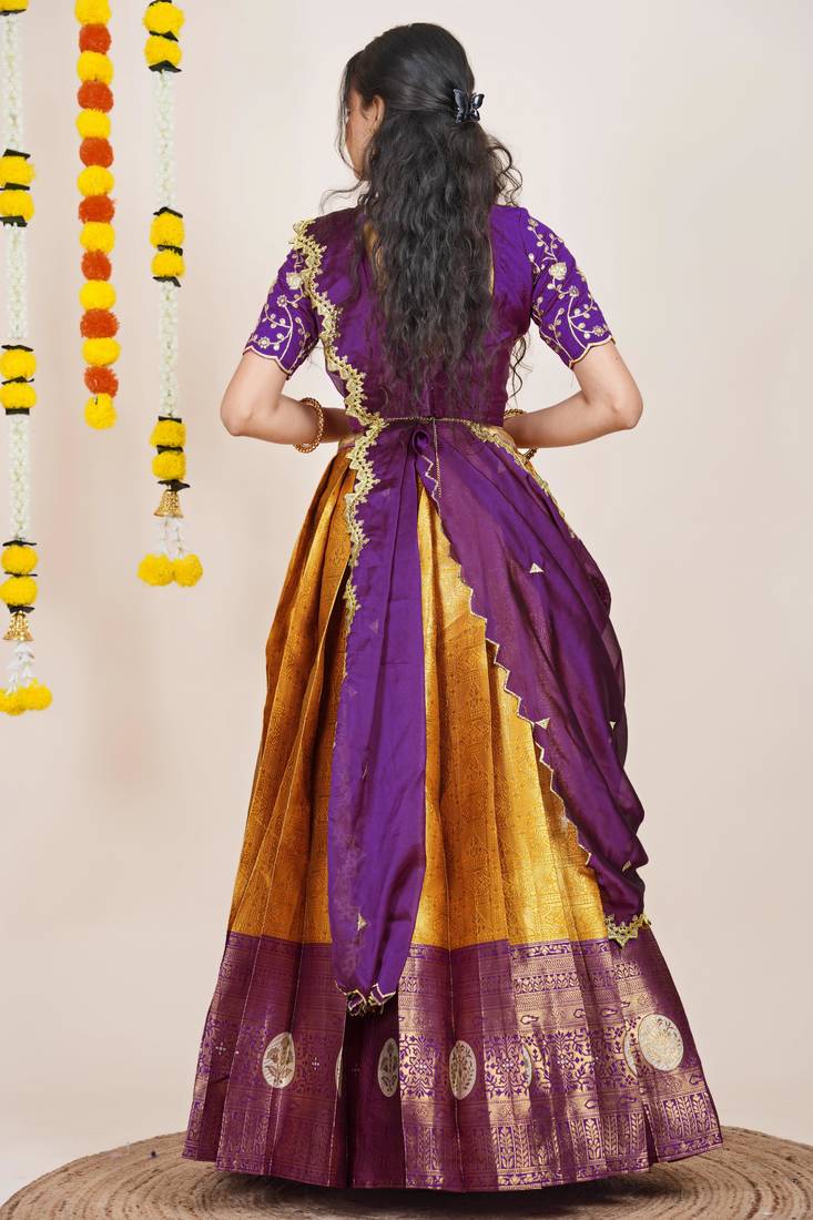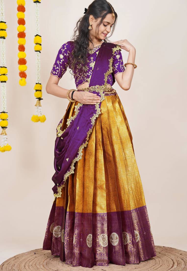| Product Name | Beautiful South Indian Style Semi Stitched Half Saree With Embroidered Blouse And Rangoli Dupatta For Women | |