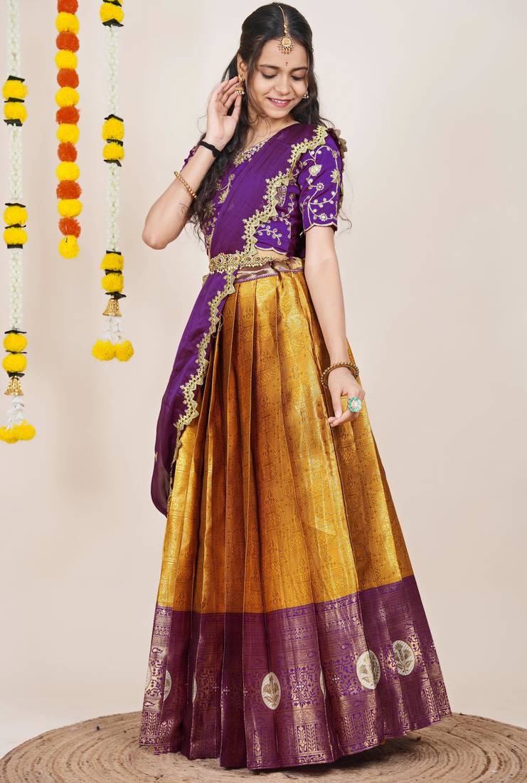 Beautiful south indian style semi-stitched half saree with embroidered blouse and rangoli dupatta for women