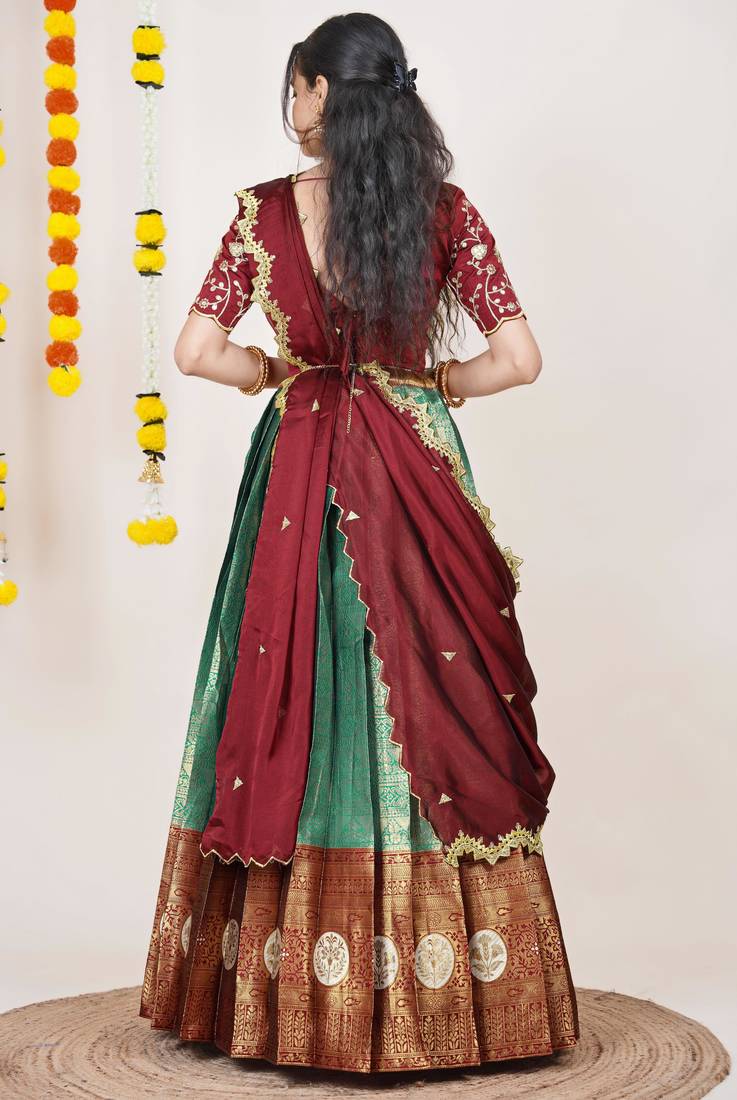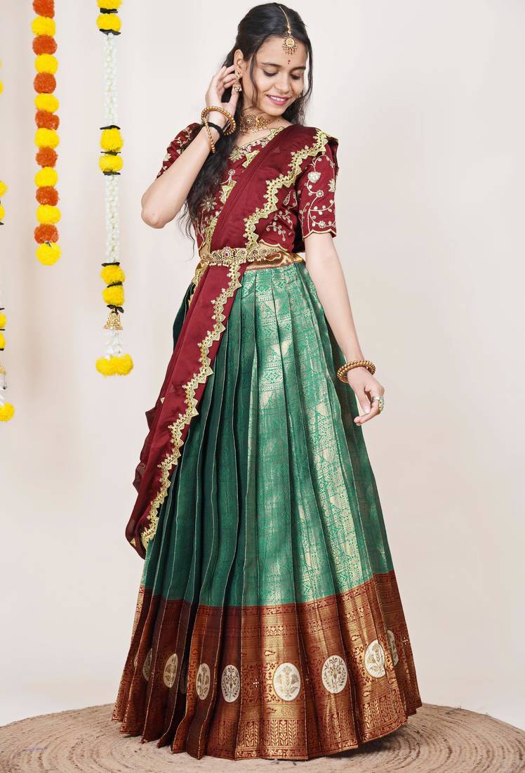Product Name Beautiful South Indian Style Semi Stitched Half Saree With Embroidered Blouse And Rangoli Dupatta For Women