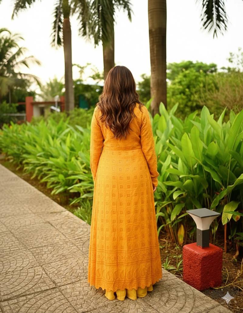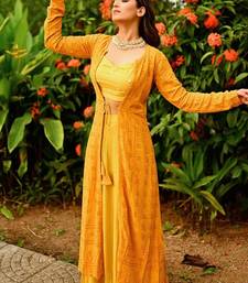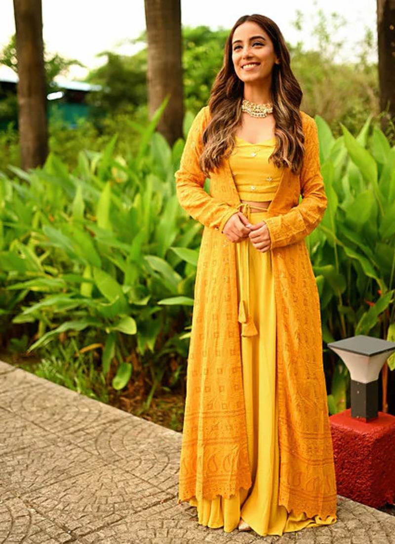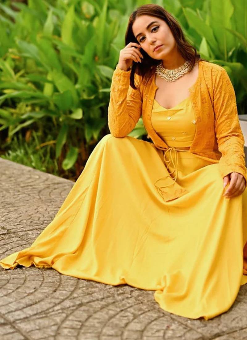 Mustard Lehenga Choli Sets Like This Elegant Haldi Ready Ensemble Bring Vibrant Charm And Modern Festive Style To Wedding Celebrations. Designed In A Beautiful Mustard Yellow Shade, This Lehenga Choli Set Features A Stylish Blouse Paired With A Flowy Lehenga That Creates A Graceful And Flattering Silhouette. The Highlight Of The Outfit Is The Intricately Patterned Long Jacket That Adds A Contemporary Layer While Maintaining Traditional Elegance.
