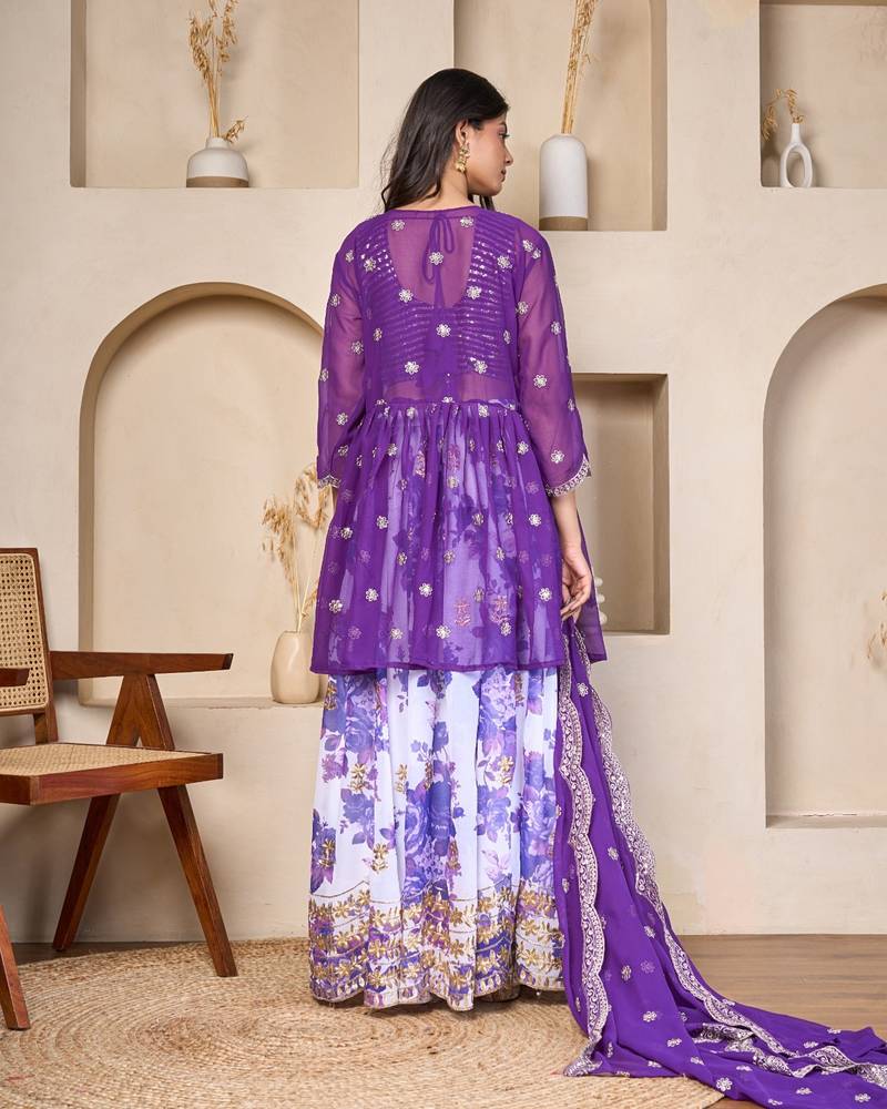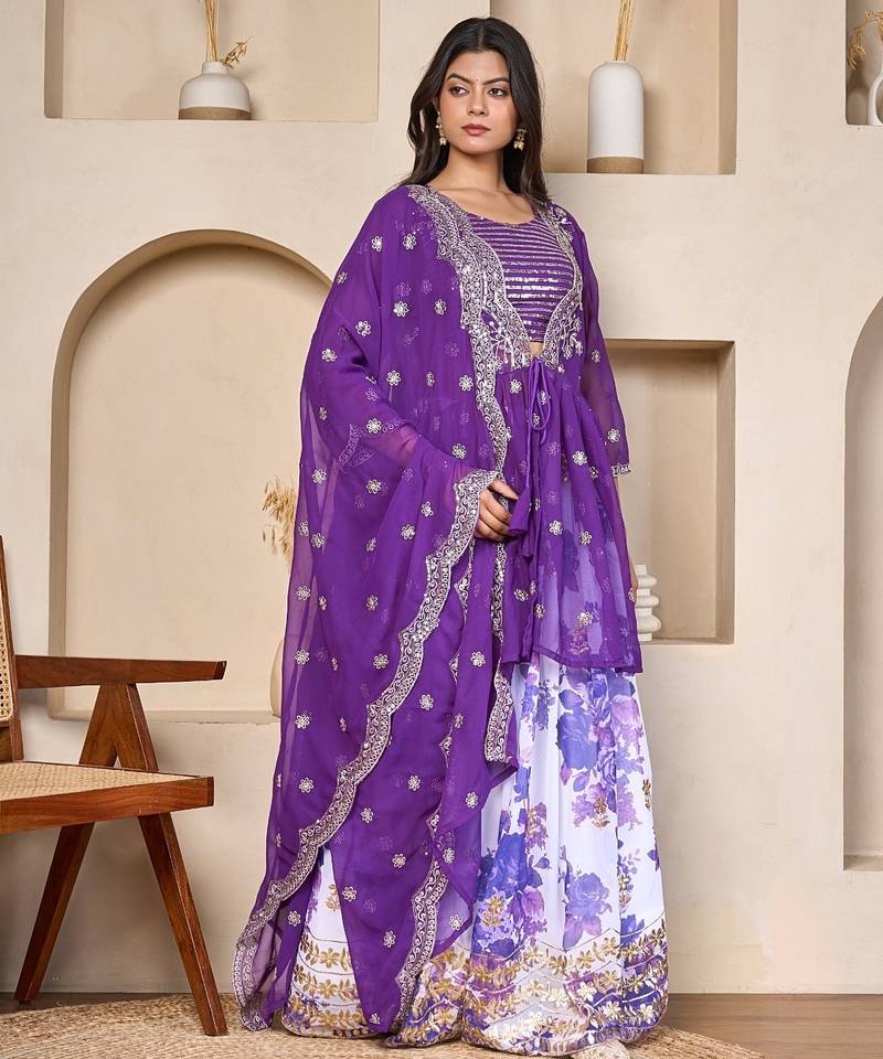 This Royal Purple Georgette Lehenga Set Brings Together Printed Patterns And Delicate Embroidery For A Graceful Festive Look. The Set Features A Beautifully Printed Lehenga With Floral Motifs That Add Depth And Visual Appeal. The Embroidered Crop Top Is Paired With A Stylish Long Jacket Detailed With Intricate Embroidery, Giving The Outfit A Layered And Elegant Design. The Matching Dupatta Is Decorated With Subtle Embroidered Motifs And A Neat Border That Completes The Overall Look.