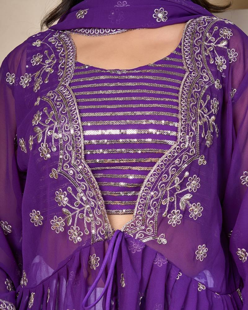 royal purple georgette lehenga set with embroidered jacket dupatta