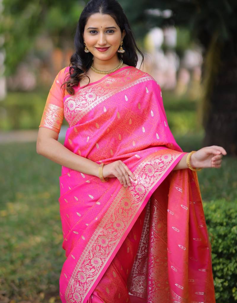 | Product Description | Elevate Your Ethnic Style With This Elegant Magenta Banarasi Silk Blend Saree Designed With Traditional Zari Weaving. The Saree Features Delicate Gold Zari Butti Motifs Across The Body, Complemented By A Richly Detailed Floral Border And An Intricately Woven Pallu That Reflects Timeless Banarasi Craftsmanship. Its Luxurious Fabric Provides A Graceful Drape With A Subtle Sheen, Making It Perfect For Weddings, Festive Celebrations, And Cultural Occasions. The Vibrant Magenta Color Combined With Classic Gold Zari Detailing Creates A Sophisticated And Eye Catching Look. Paired With A Matching Blouse Piece, This Saree Beautifully Blends Tradition And Elegance While Ensuring Comfort And Style For Every Special Occasion. |