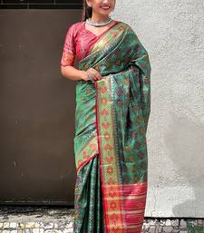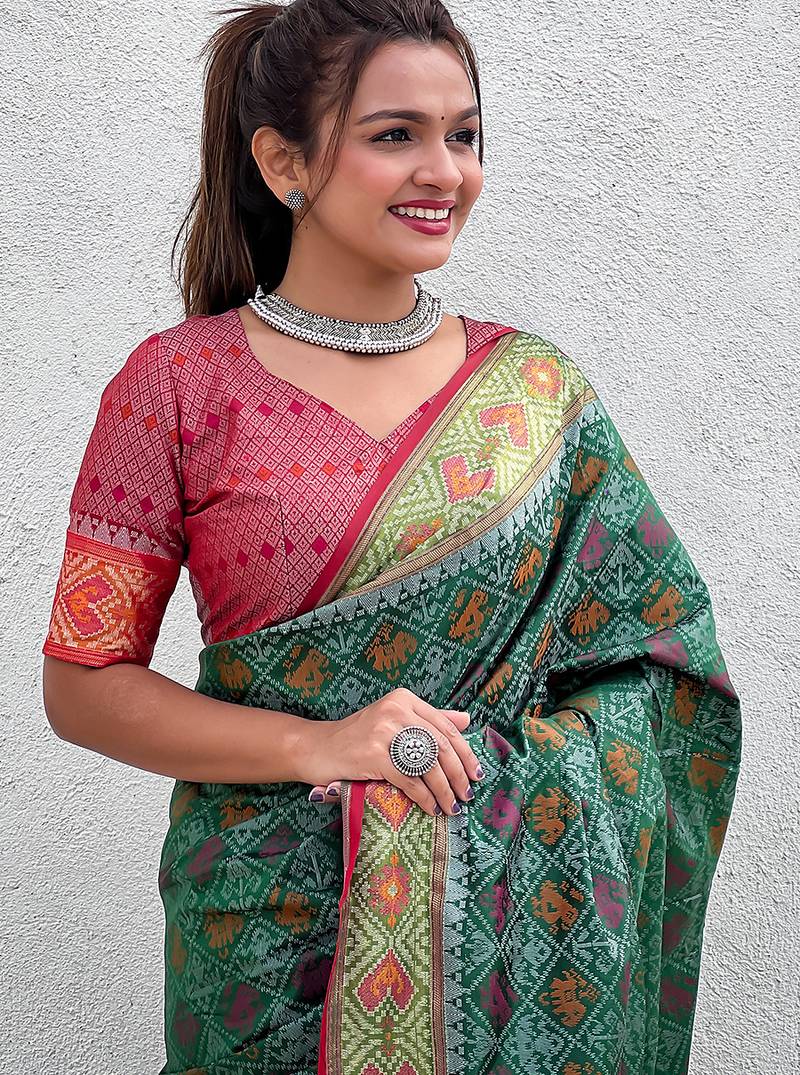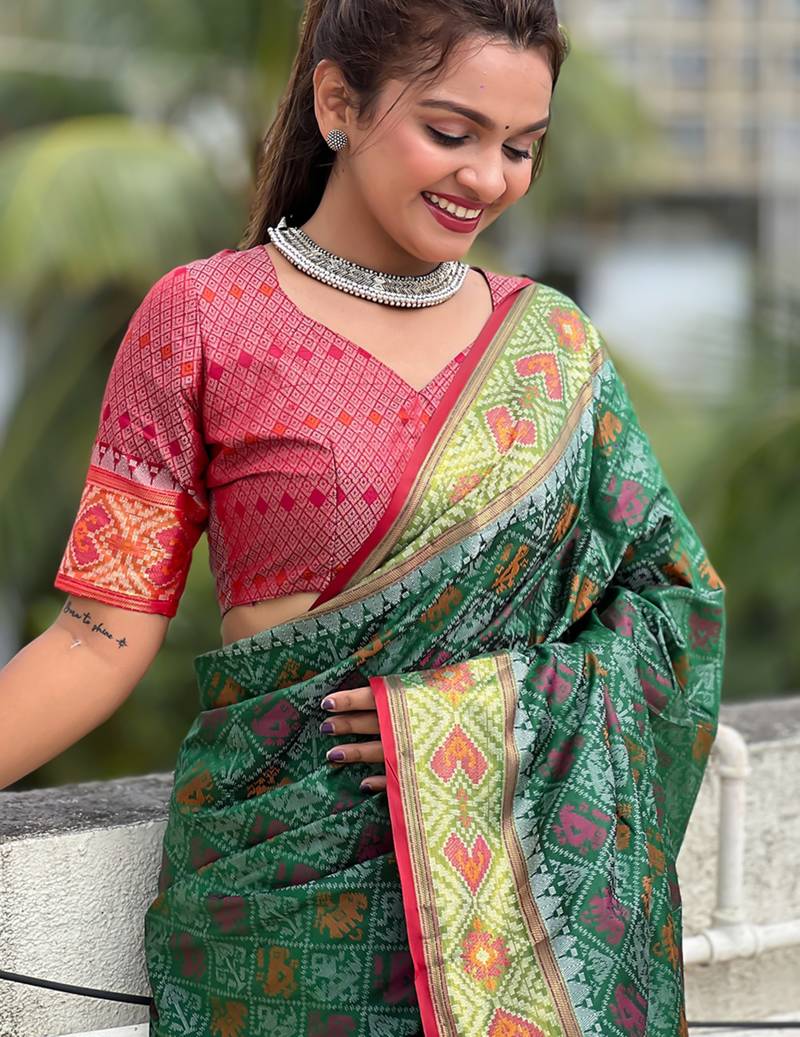 Green patola silk lagdi pallu zari weaving saree with contrast blouse piece