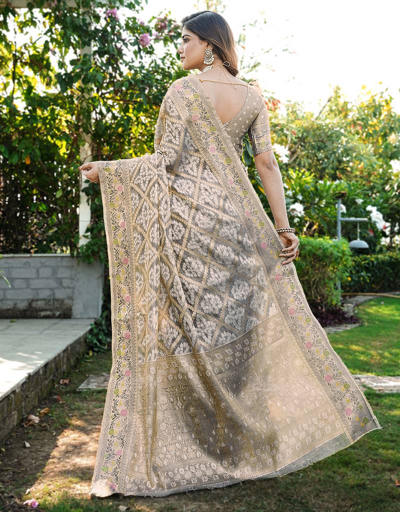 Grey organza silk bandhani patola weaves saree with matching blouse piece