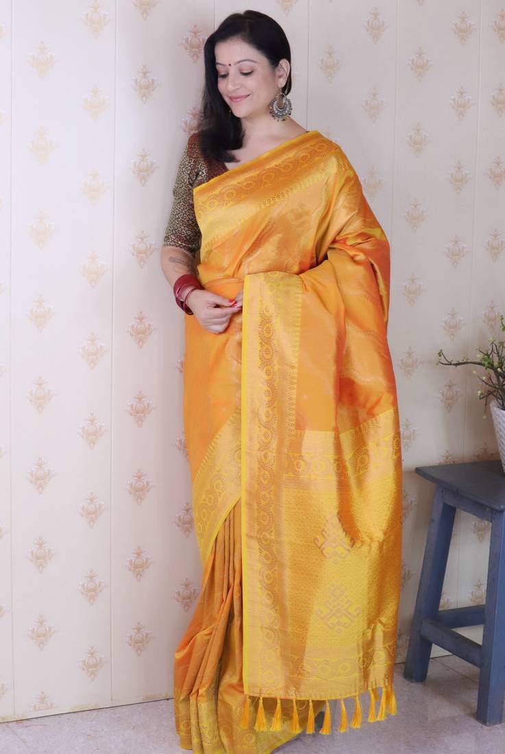 | Product Description | Add Timeless Elegance To Your Ethnic Collection With This Beautiful Yellow And Orange Art Silk Saree Featuring Delicate Woven Zari Work. The Saree Showcases Traditional Motifs Across The Body Along With A Rich Border And Intricately Designed Pallu That Enhances Its Classic Appeal. Crafted From Smooth Art Silk Fabric, It Provides A Graceful Drape And Comfortable Wear Throughout The Day. The Vibrant Color Combination Gives It A Festive Charm, Making It Perfect For Weddings, Festivals, And Cultural Occasions. Paired With A Matching Blouse Piece And Decorative Tassels On The Pallu, This Saree Reflects Traditional Craftsmanship While Offering A Sophisticated And Elegant Look. |