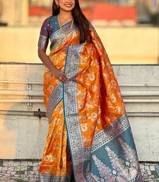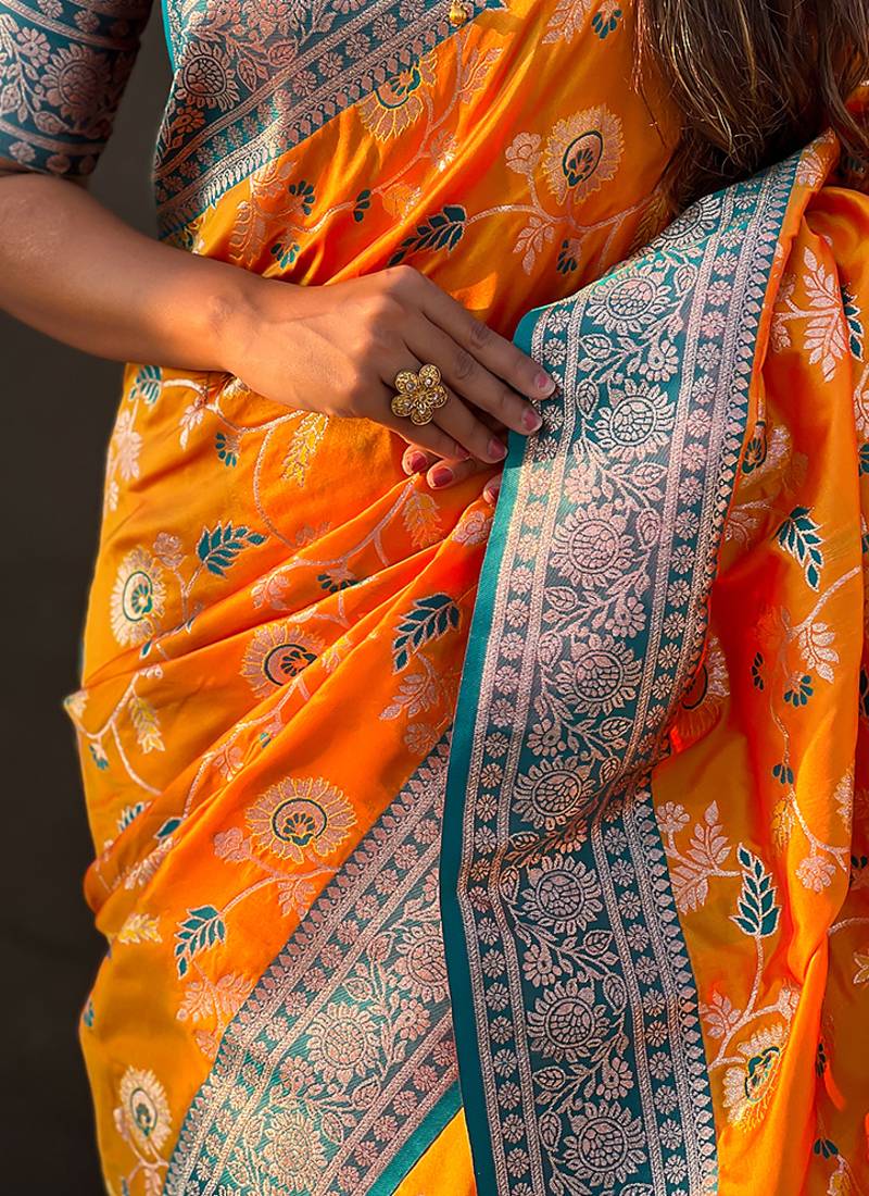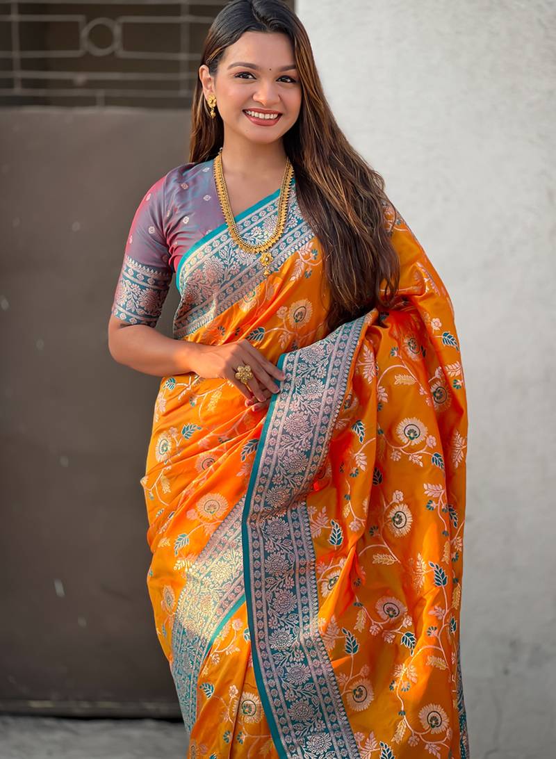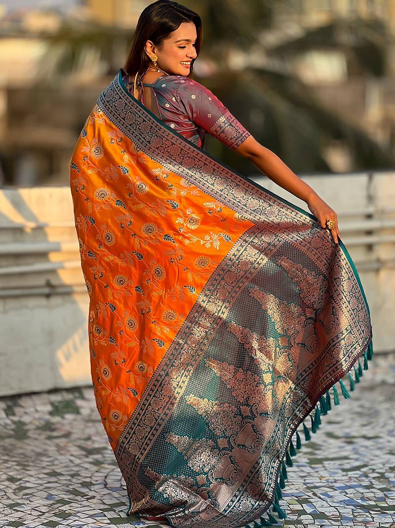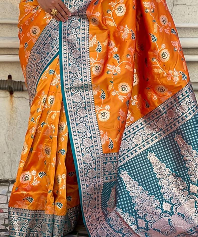 Orange banarasi silk zari woven saree with contrast blouse piece