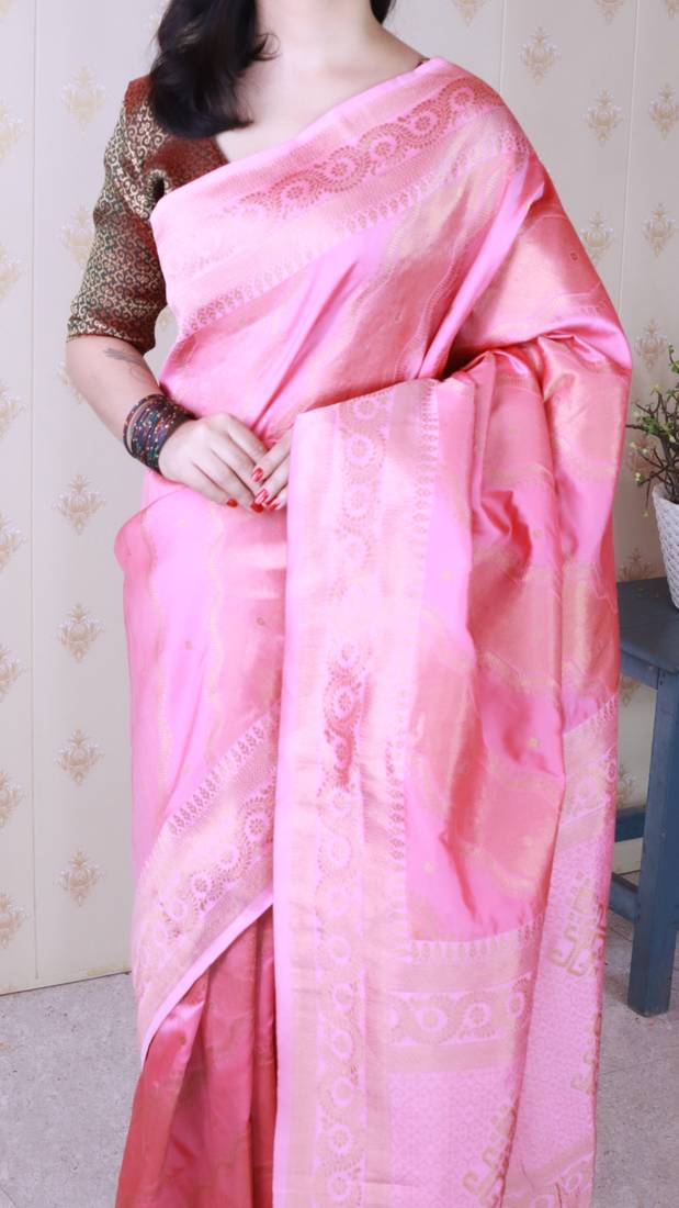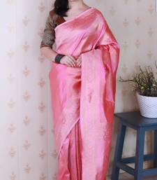 Pink banarasi silk leheriya zari woven saree with contrast blouse piece
