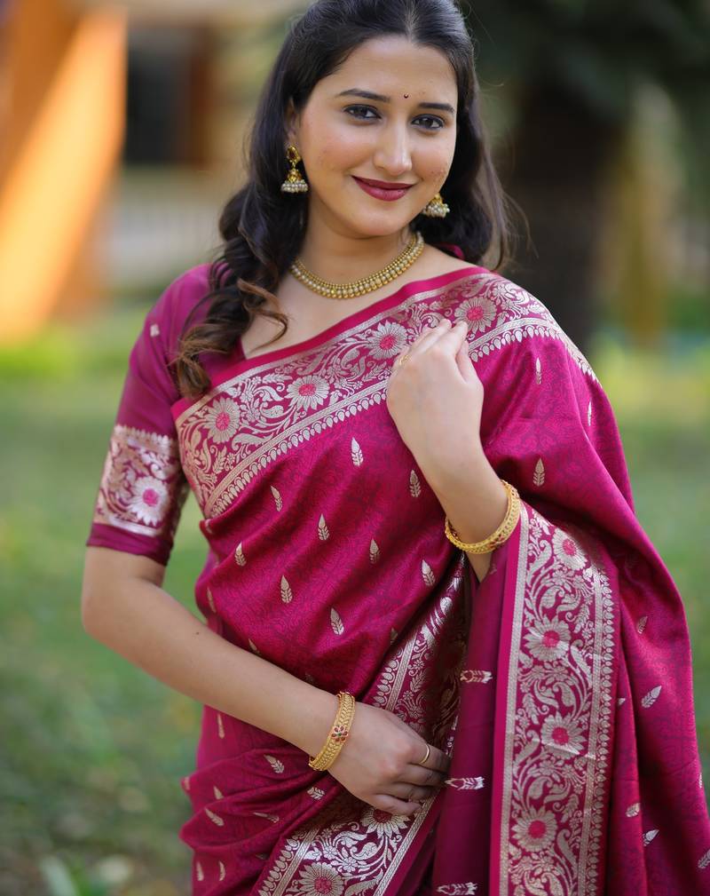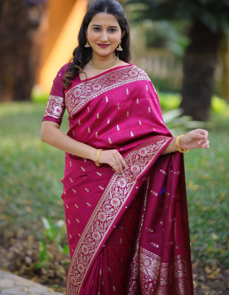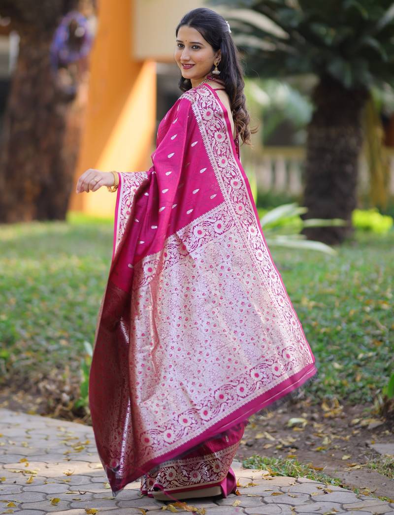 | Product Description | Elevate Your Ethnic Style With This Elegant Magenta Banarasi Silk Blend Saree Designed With Traditional Zari Weaving. The Saree Features Delicate Gold Zari Butti Motifs Across The Body, Complemented By A Richly Detailed Floral Border And An Intricately Woven Pallu That Reflects Timeless Banarasi Craftsmanship. Its Luxurious Fabric Provides A Graceful Drape With A Subtle Sheen, Making It Perfect For Weddings, Festive Celebrations, And Cultural Occasions. The Vibrant Magenta Color Combined With Classic Gold Zari Detailing Creates A Sophisticated And Eye Catching Look. Paired With A Matching Blouse Piece, This Saree Beautifully Blends Tradition And Elegance While Ensuring Comfort And Style For Every Special Occasion. |
