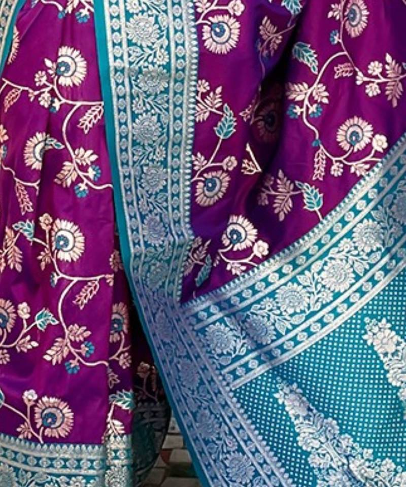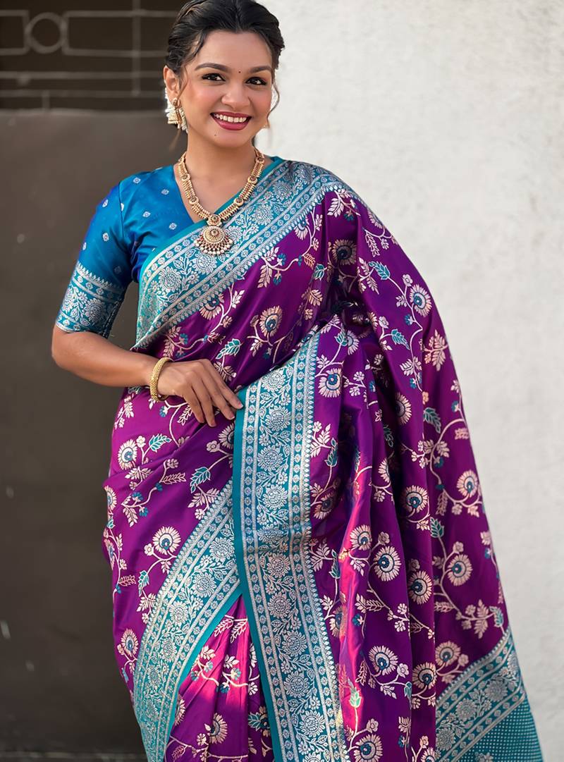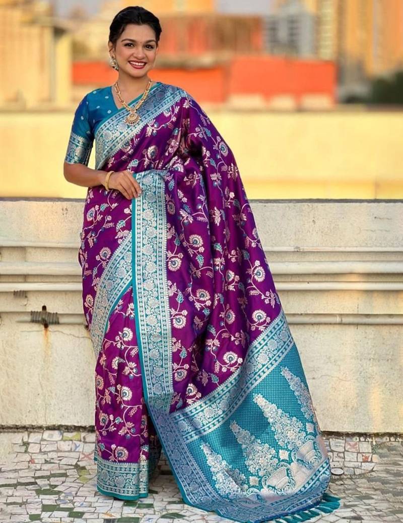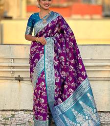 Purple banarasi silk zari woven saree with contrast blouse piece