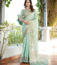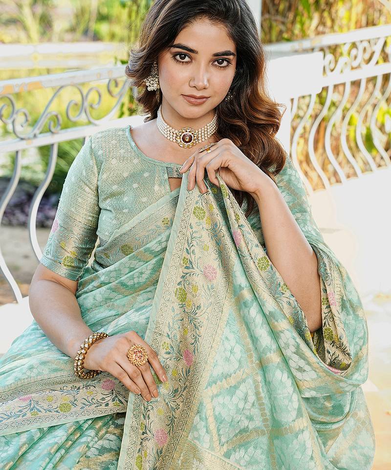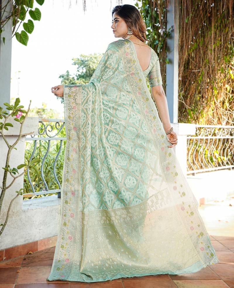 Sea green organza silk bandhani patola weaves saree with matching blouse piece