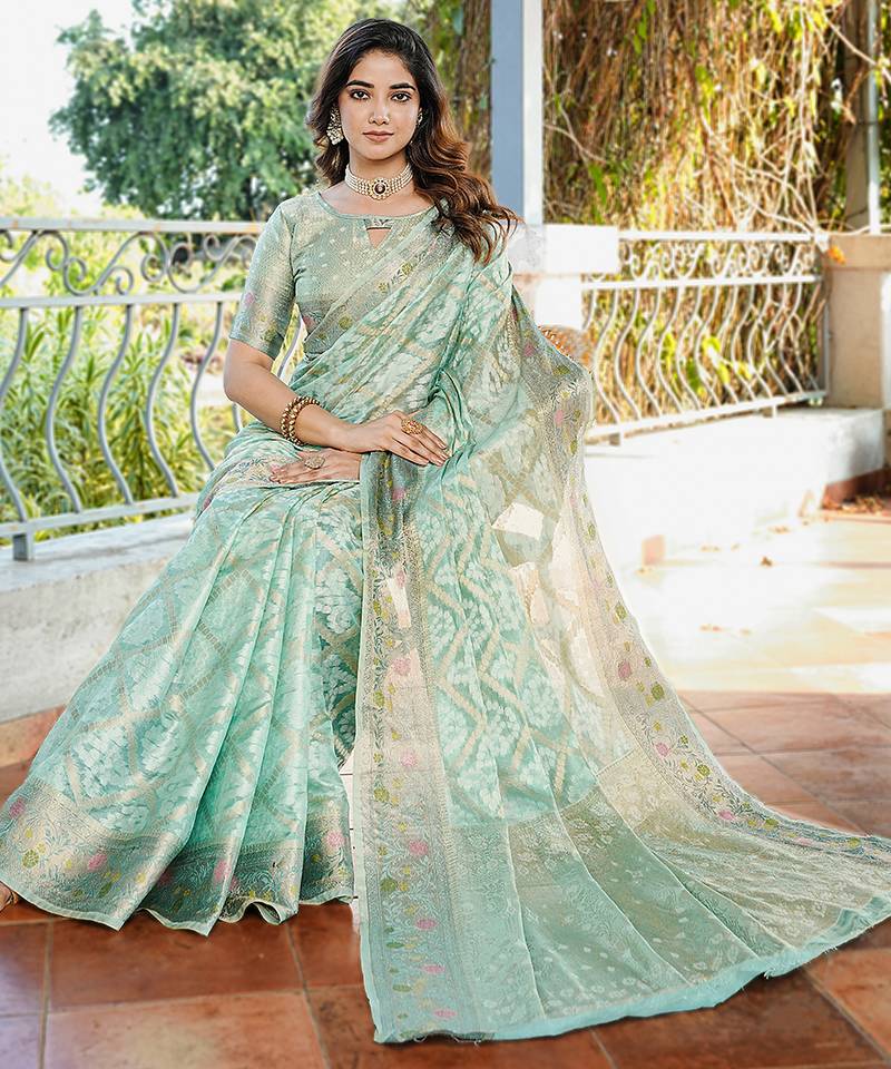| Product Name | Sea Green Organza Silk Bandhani Patola Weaves Saree With Matching Blouse Piece | |