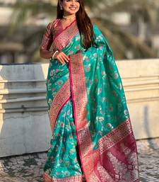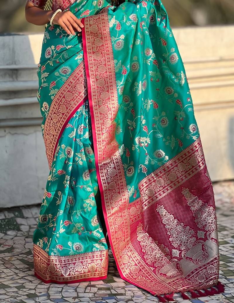 Teal banarasi silk zari woven saree with contrast blouse piece