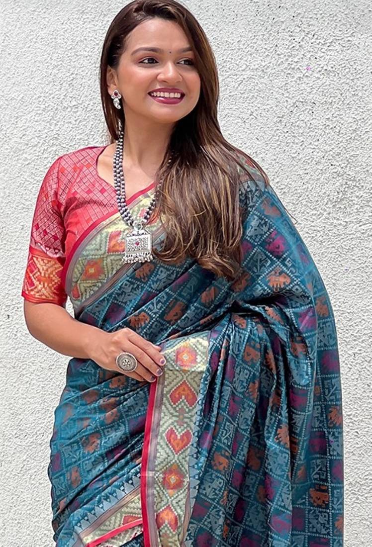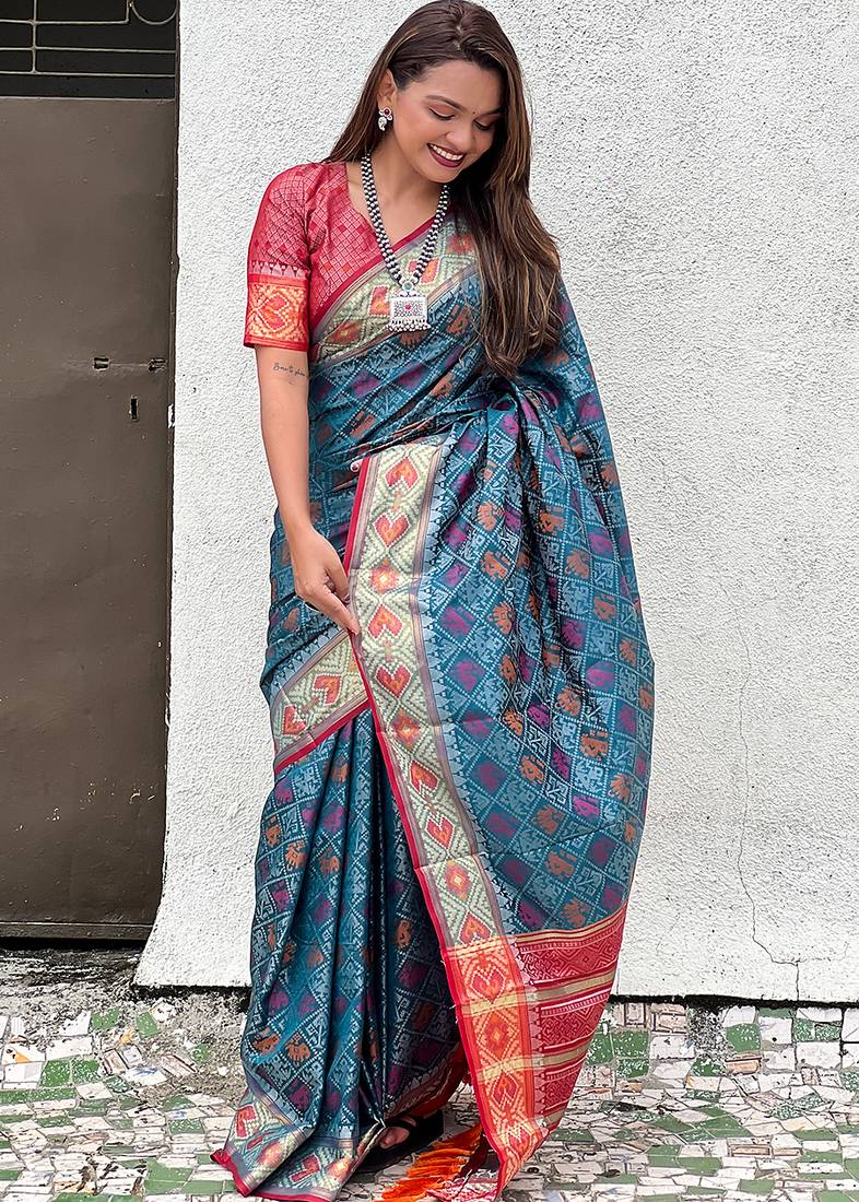 Teal patola silk lagdi pallu zari weaving saree with contrast blouse piece