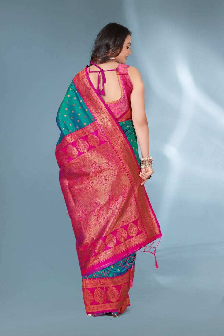 Teal soft silk paithani zari weaving saree with contrast blouse piece