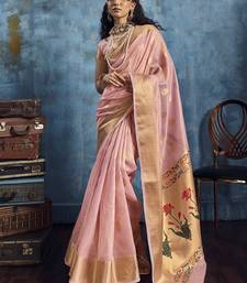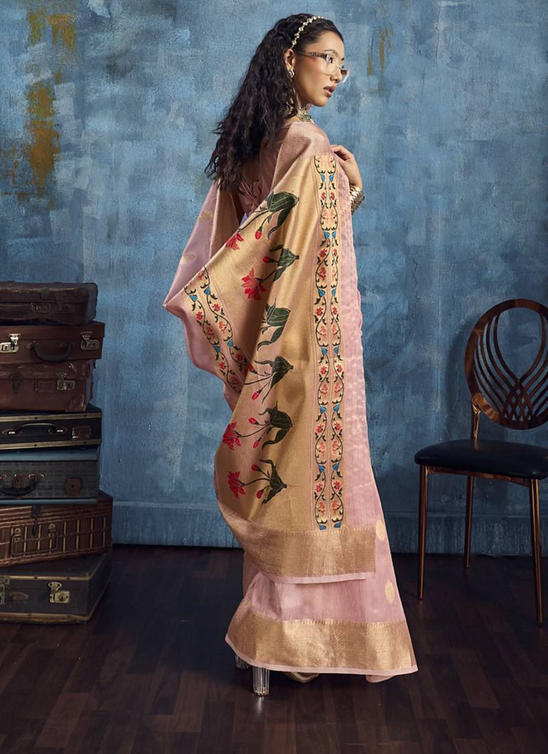Baby pink zari tissue handloom weaving saree