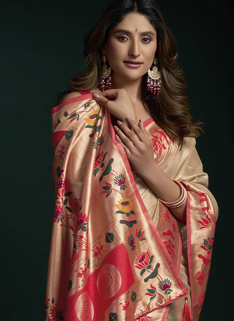 | Product Name | Off White Tissue Paithani Saree Mina With Lotus Zari Border | |