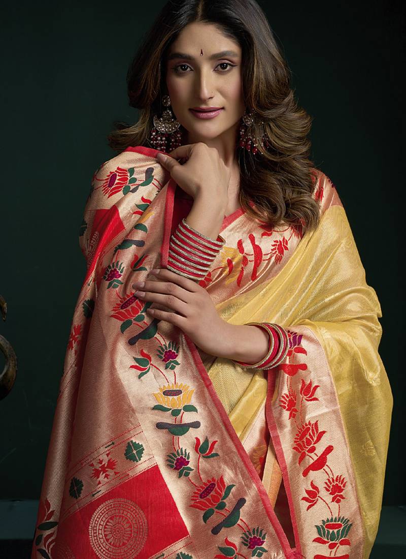 Product Name Yellow Tissue Paithani Saree Mina With Lotus Zari Border