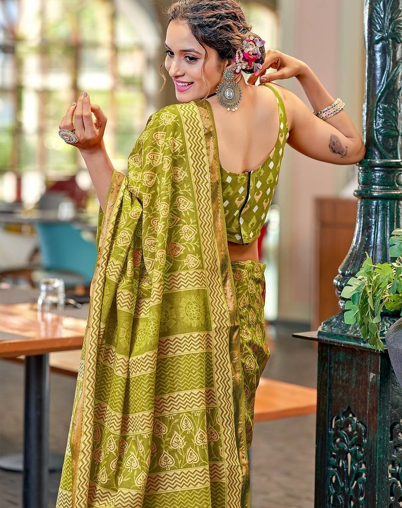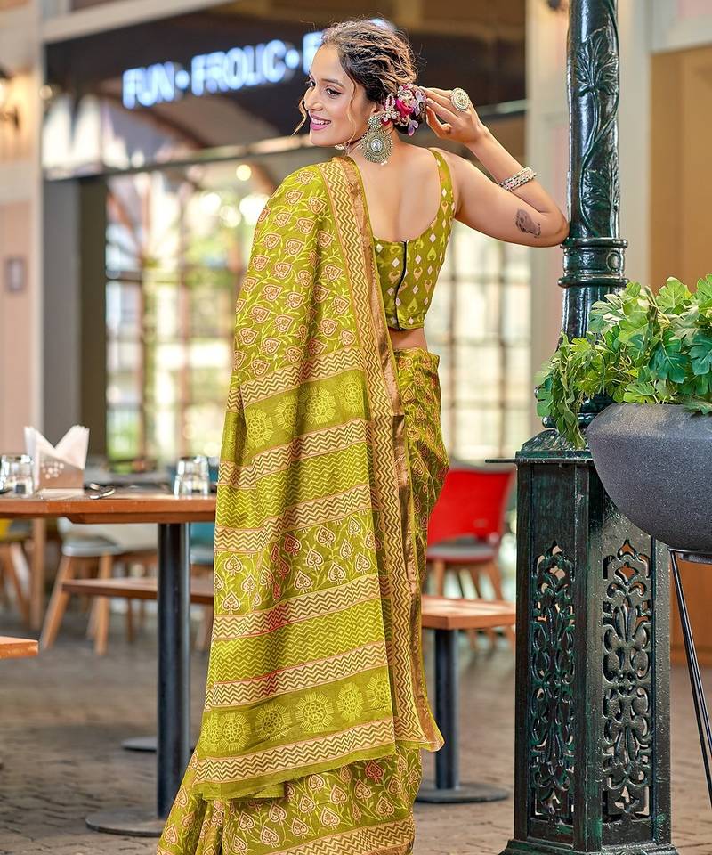 | • | Saree | : | Color- Mehendi / Fabric- Pure Cotton |