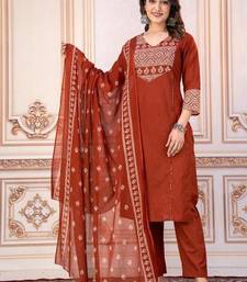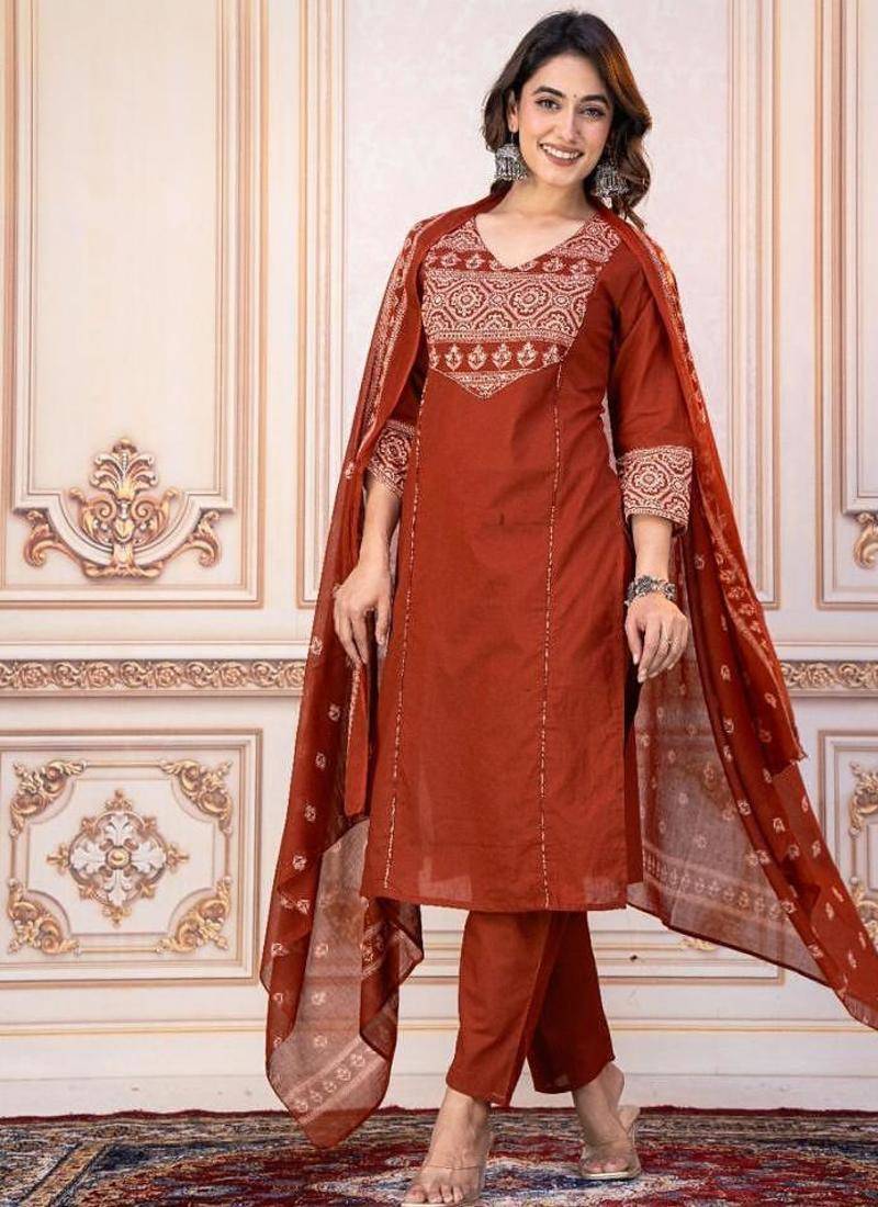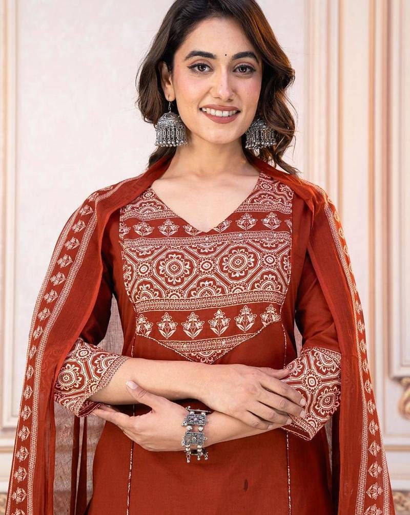 | Product Description | A Rust Orange Printed Kurta Set With A Matching Dupatta And Solid Pants, Which Is A Popular Style Of Women's Ethnic Wear In India. The Straight Fit Kurta Features Floral Block Prints And A V Neckline. |