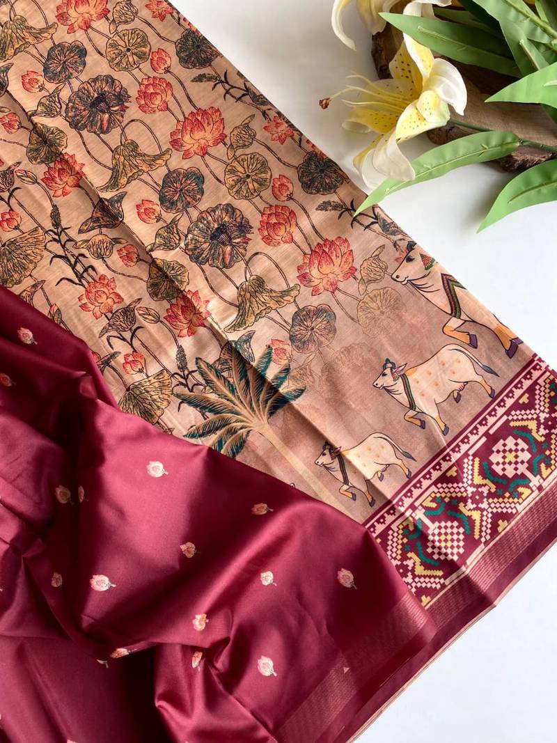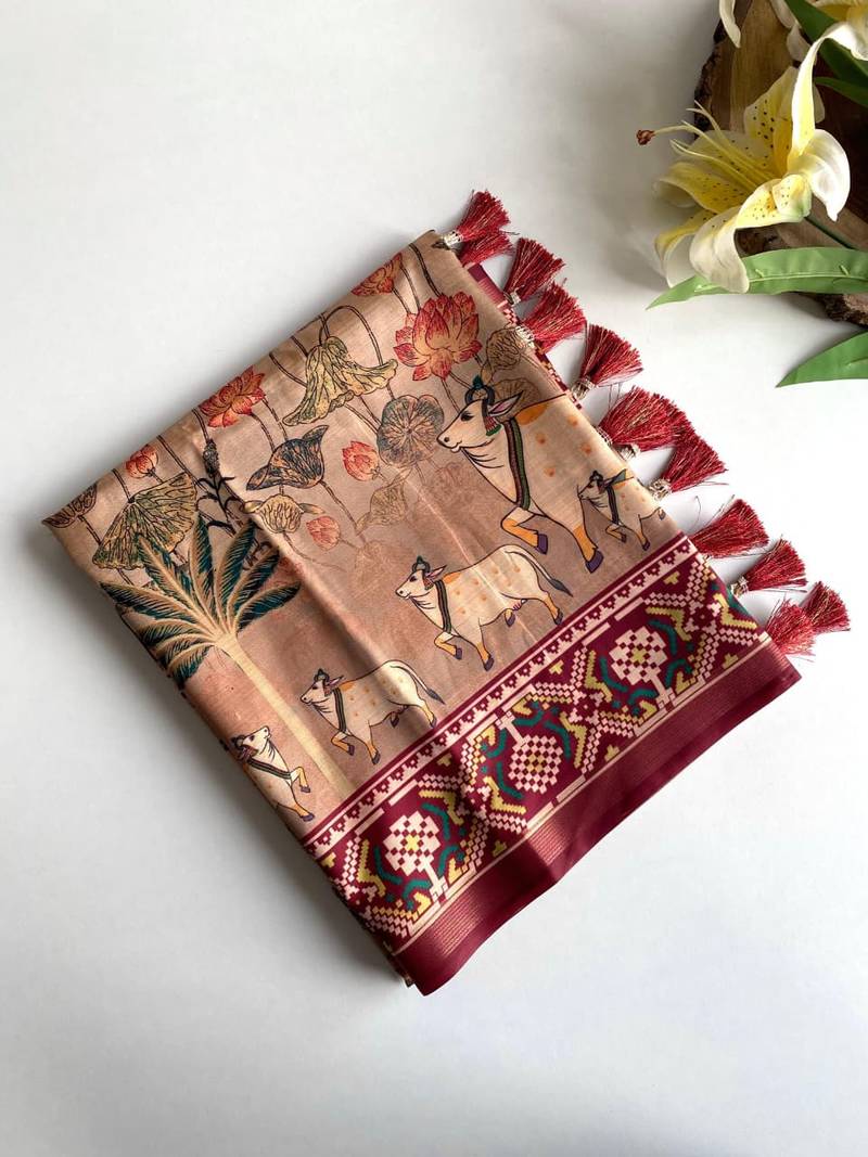 Saree Dola Viscose Sarees With Premium Viscose Zari Patta Border And Beautiful Digital Print All Over The Saree With Tassels Attached.