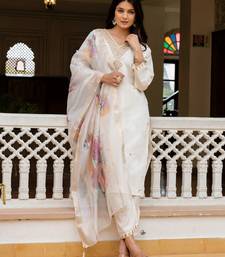 White embroidered viscose chanderi kurta set with dupatta stitched
