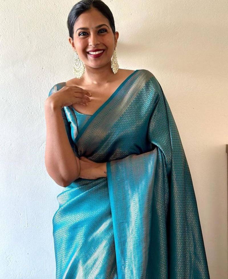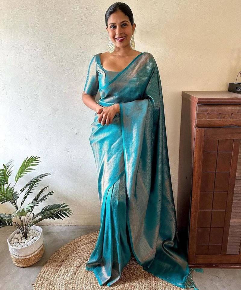 Product Name Light Weight Aqua Blue Self Design Art Silk Jacquard Saree With Unstitched Blouse