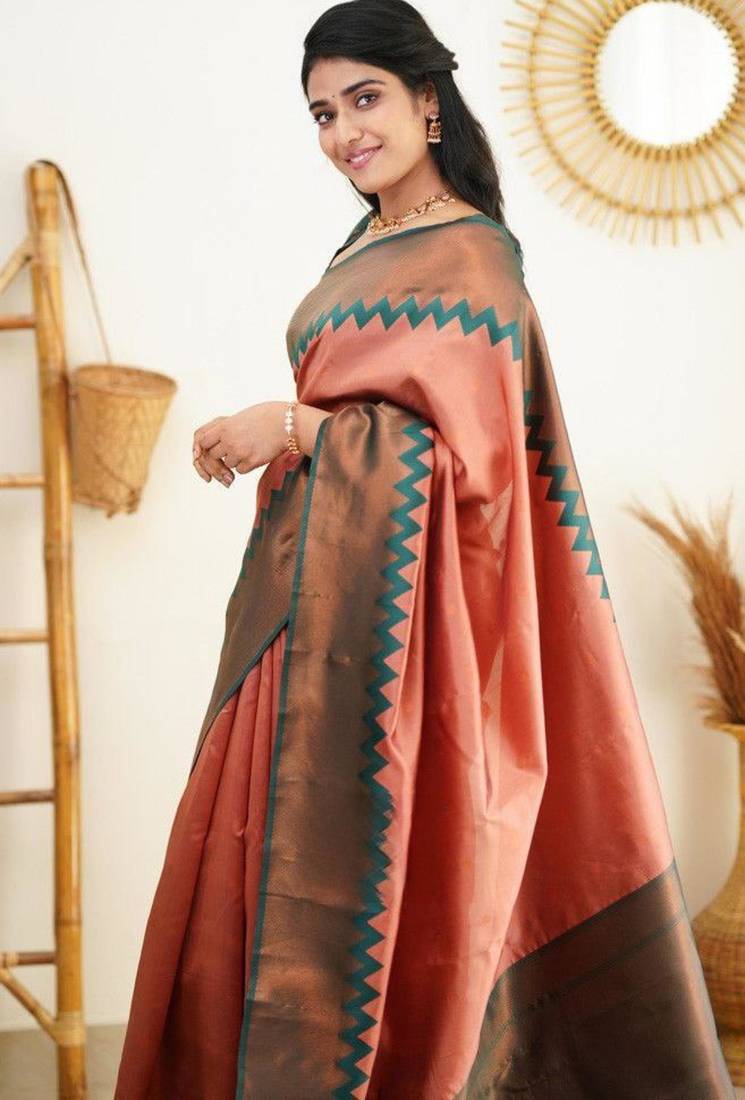 It Is A Silk Saree Featuring A Copper Zari Design Throughout The Fabric. Brocade Weaving Is A Time Intensive Form Of Weaving Known For Its Rich Texture.