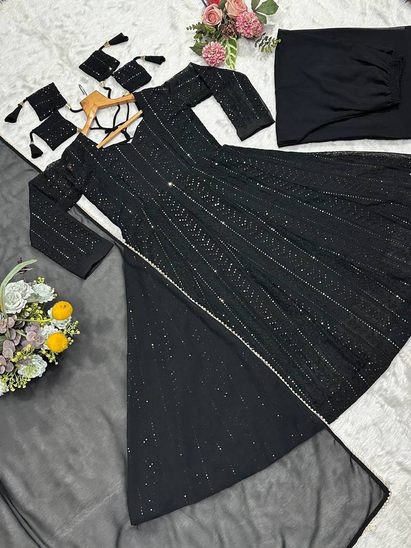 Black sequins & zari embroidered faux blooming fully stitched anarkali gown
