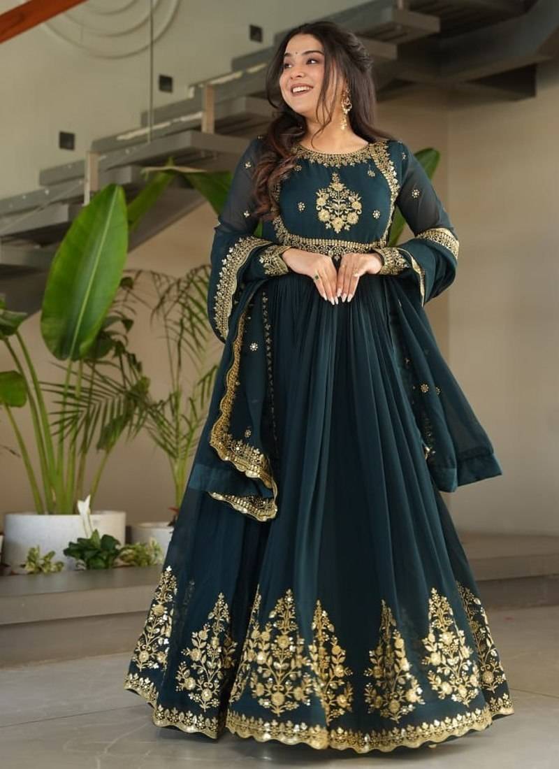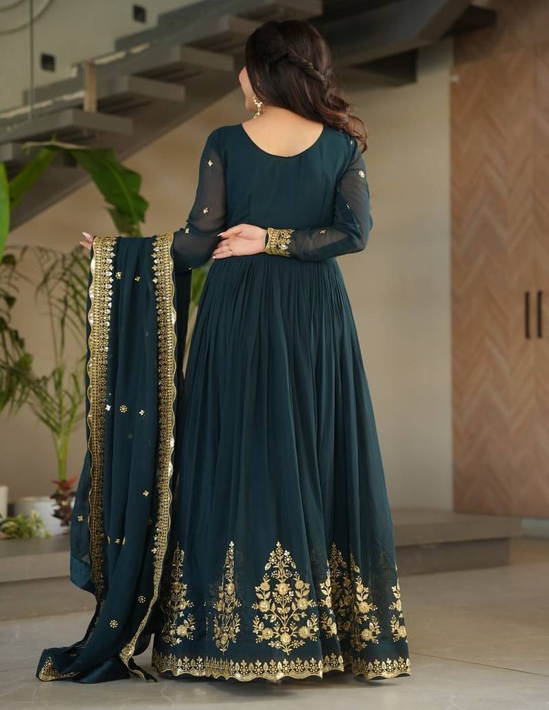 Dark teal green zari thread & sequins embroidered faux blooming georgette anarkali gown with dupatta stitched