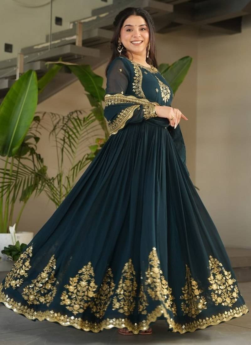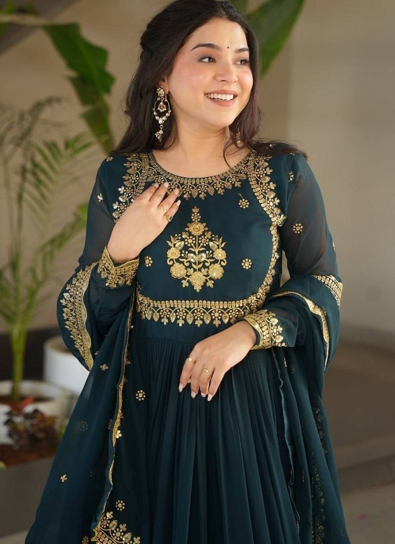 | Product Name | Dark Teal Green Zari Thread & Sequins Embroidered Faux Blooming Georgette Anarkali Gown With Dupatta | |