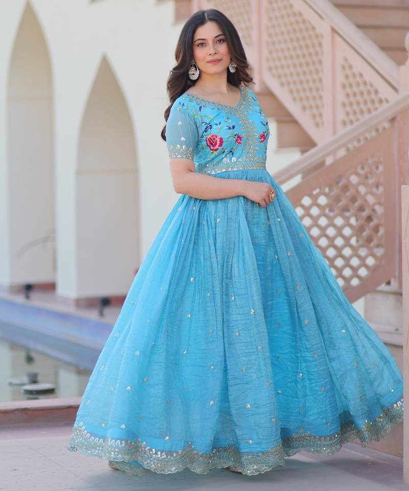 | Product Name | Sky Blue Designer Embroidered Gold Crush Anarkali Gown – Party Wear | |