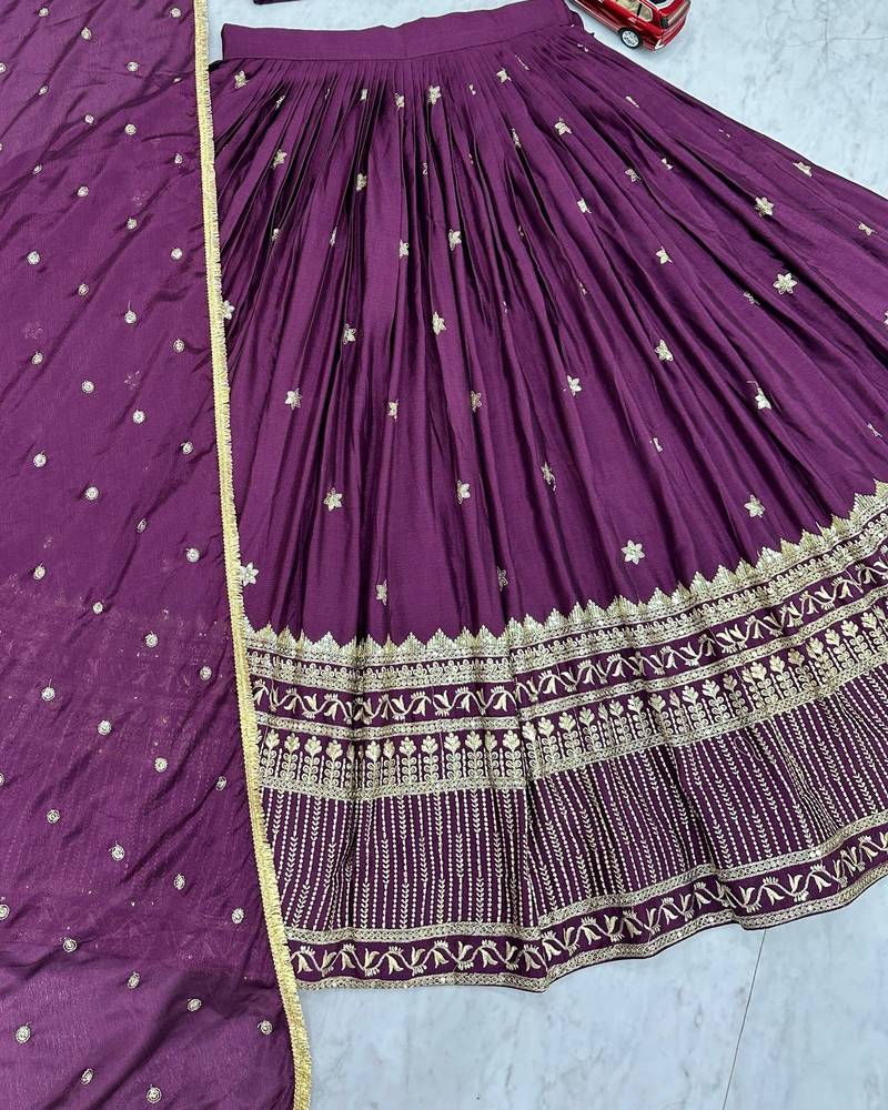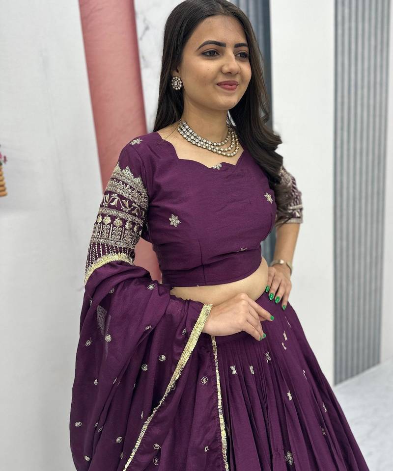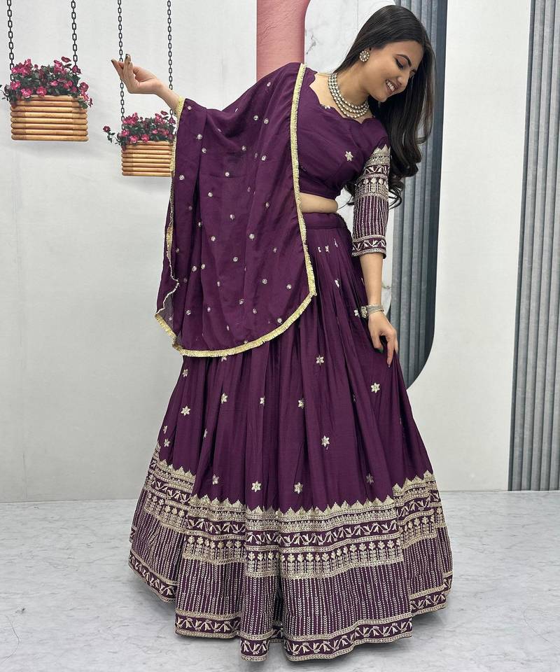 | Product Name | Wine Chinon Silk Fabric Sequins & Thread Embroidered Lehenga Choli Set With Matching Dupatta | |