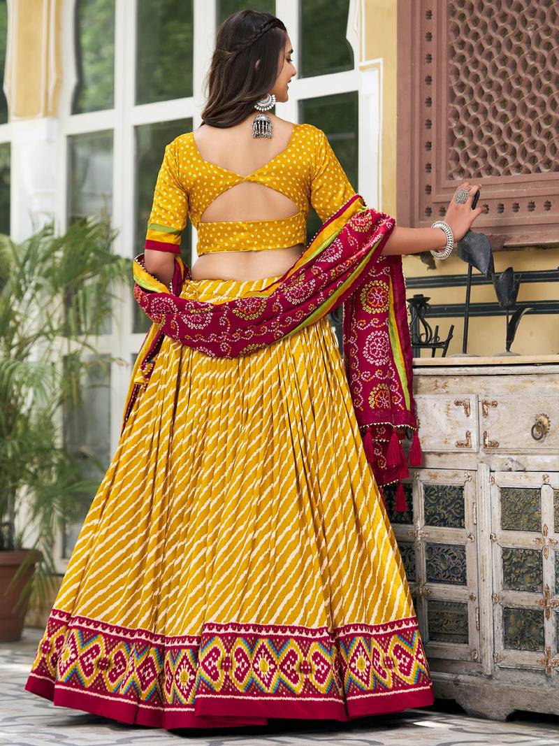 | Product Name | Yellow Tussar Dola Silk Fabric Leheriya Print Lehenga Choli Set With Dupatta | |