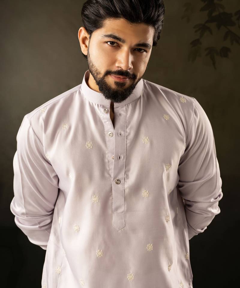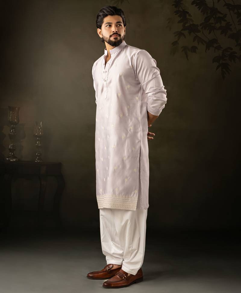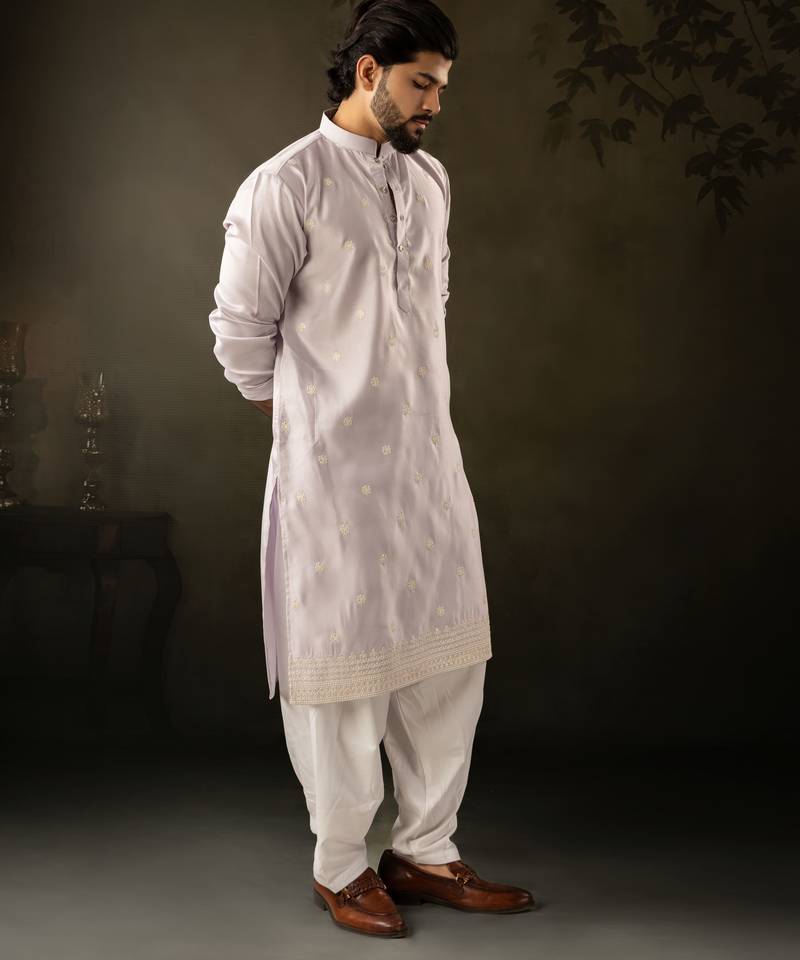 Light purple color rayon fabric designer embroidered partywear kurta payjama for men