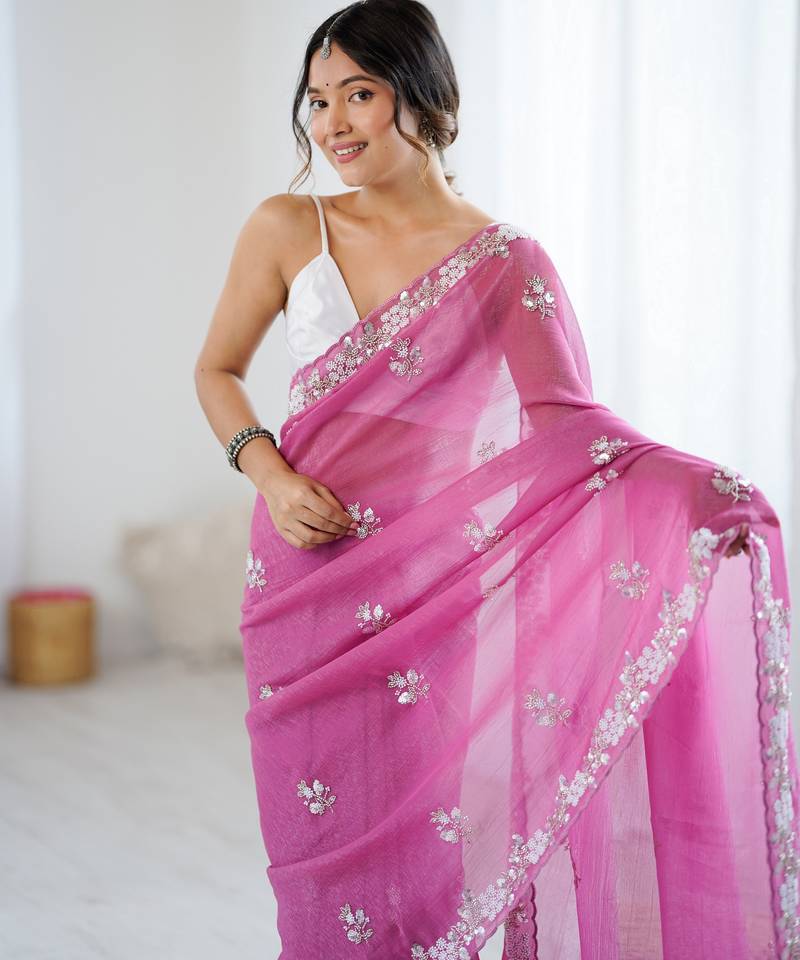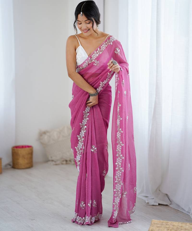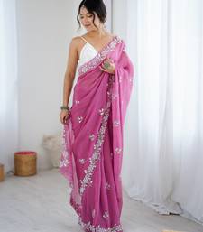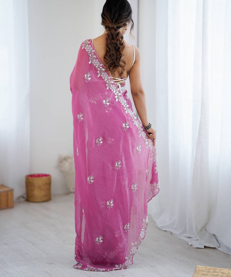 Pink color chiffon crush fabric heavy designer work partywear saree