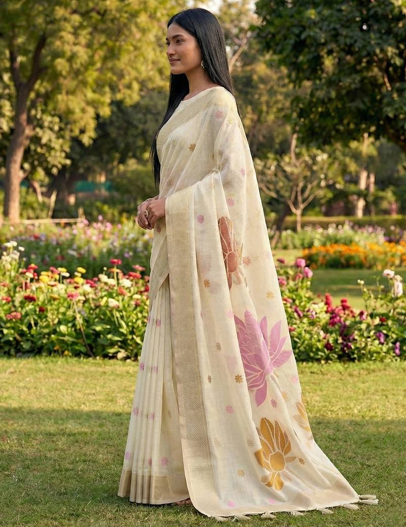 White color linen cotton fabric woven designer partywear saree