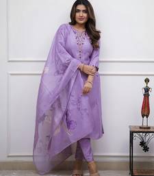 Women's rayon silk embroidered lavender kurta pant set with chanderi dupatta stitched